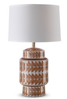 The Peru Table Lamp features a striking brown and blue Aztec pattern on a white ceramic base, blending traditional design with modern craftsmanship. Its distinctive motif adds cultural depth and visual interest, making it an elegant accent piece for any room. Ideal for enhancing ambient lighting, this lamp combines aesthetic appeal with functional illumination, perfect for creating a warm, inviting atmosphere.