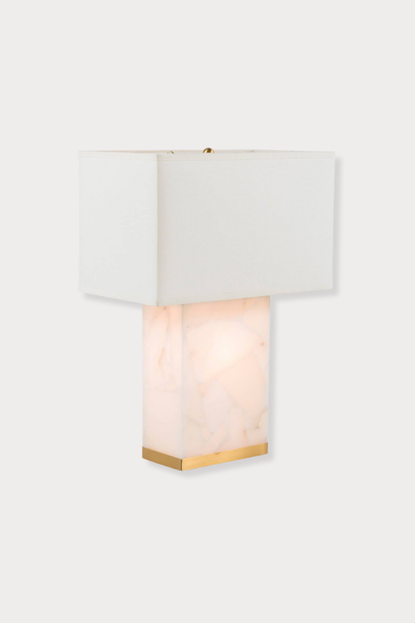Introducing the Maxx Table Lamp, crafted with a unique rectangular-shaped design and featuring warm alabaster materials, which add an inviting ambient glow to your space. With a four-way switch for versatile lighting options and stained gold metal accents for a touch of sophistication, this lamp is a must-have for any elegant and tasteful room.