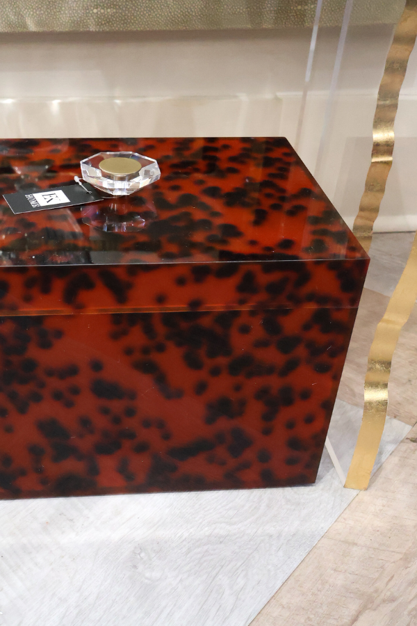 Elevate your décor with our Milan Tortoise Box! This playful 10"H x 14"W x 10"D treasure chest combines sleek acrylic with fancy metal brass feet for a touch of whimsy. Perfect for storing trinkets or simply showing off as a conversation starter – because who said storage can't be fun?