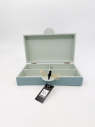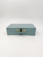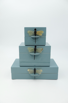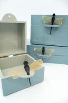 Each box in this collection is made with MDF wood covered in 13-15 layers of lacquer with a dragonfly pin closure with buffalo horn.