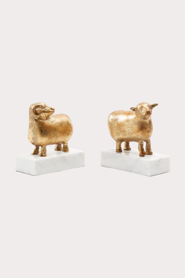 The Sheep Bookends feature a delightful pair of a ram and ewe in a gold leaf finish, each sitting on a white marble base. Perfect for those who aren’t afraid to blend whimsy with sophistication, these bookends turn ordinary shelves into captivating conversations. Whether helping you count sheep in the bedroom, holding up cookbooks in the kitchen, or adding character to open shelves, this set combines fun and function effortlessly.