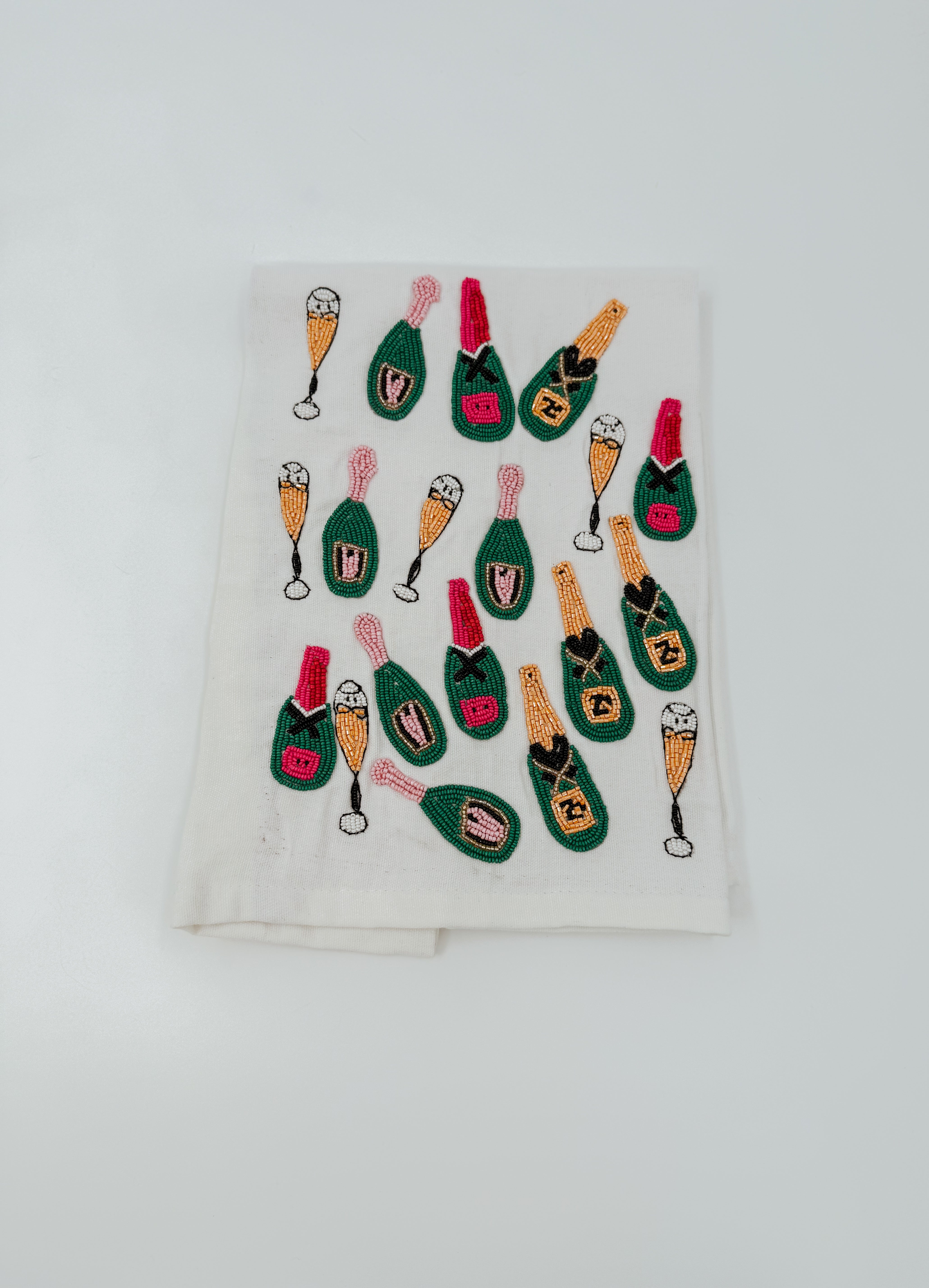 Add a touch of bubbly to your kitchen with our Champagne Beaded Tea Towel! Featuring a sparkling champagne bottle motif, this tea towel is both functional and stylish. Cheers to effortless cleaning and chic decor!