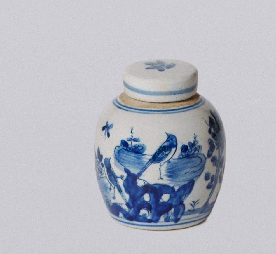 Blue and White Porcelain Mini Bird and Flower Round Storage Jar