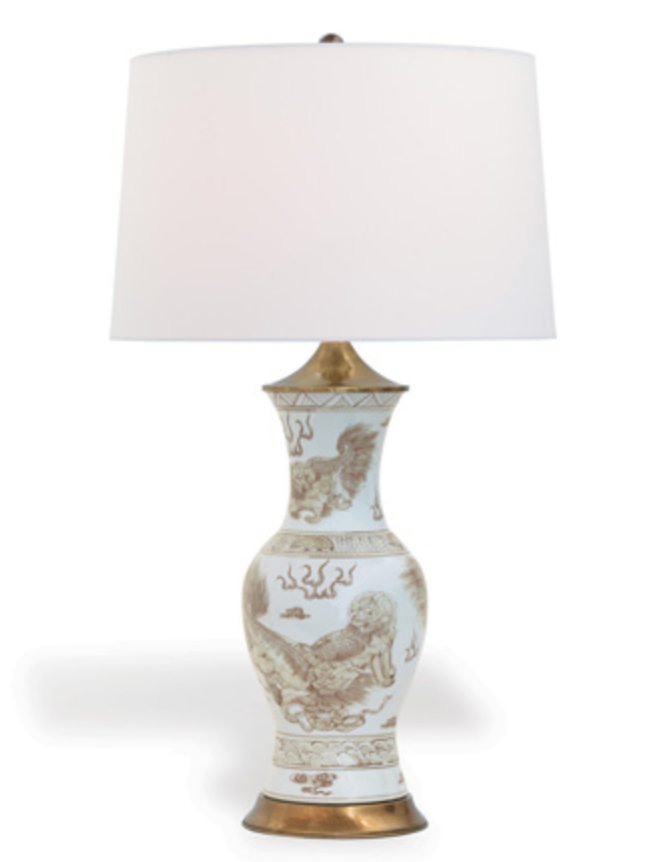The Chow Brown Lamp features charming hand-painted foo dogs on a unique fishtail-shaped porcelain base, adding a whimsical touch to any room. Accented with solid brass hardware and topped with a brass ball finial, this 34-inch lamp blends classic design with playful details for a delightful lighting experience.