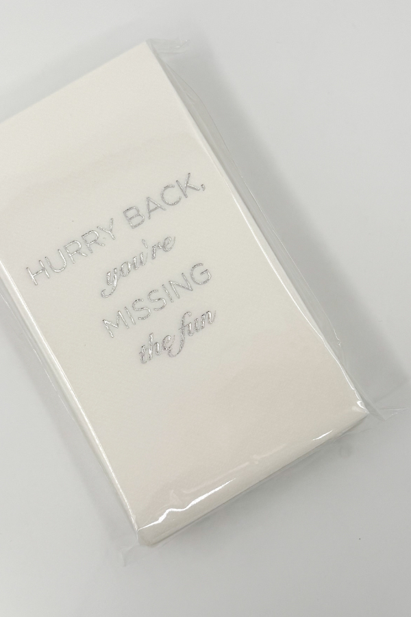 Introducing our Hurry Back You're Missing All the Fun guest napkins. Made with cloth-like material, these napkins are perfect for your next gathering. Plus, the shiny foil lettering adds a touch of elegance and humor. Don't miss out - hurry back to the party and join in on the fun!