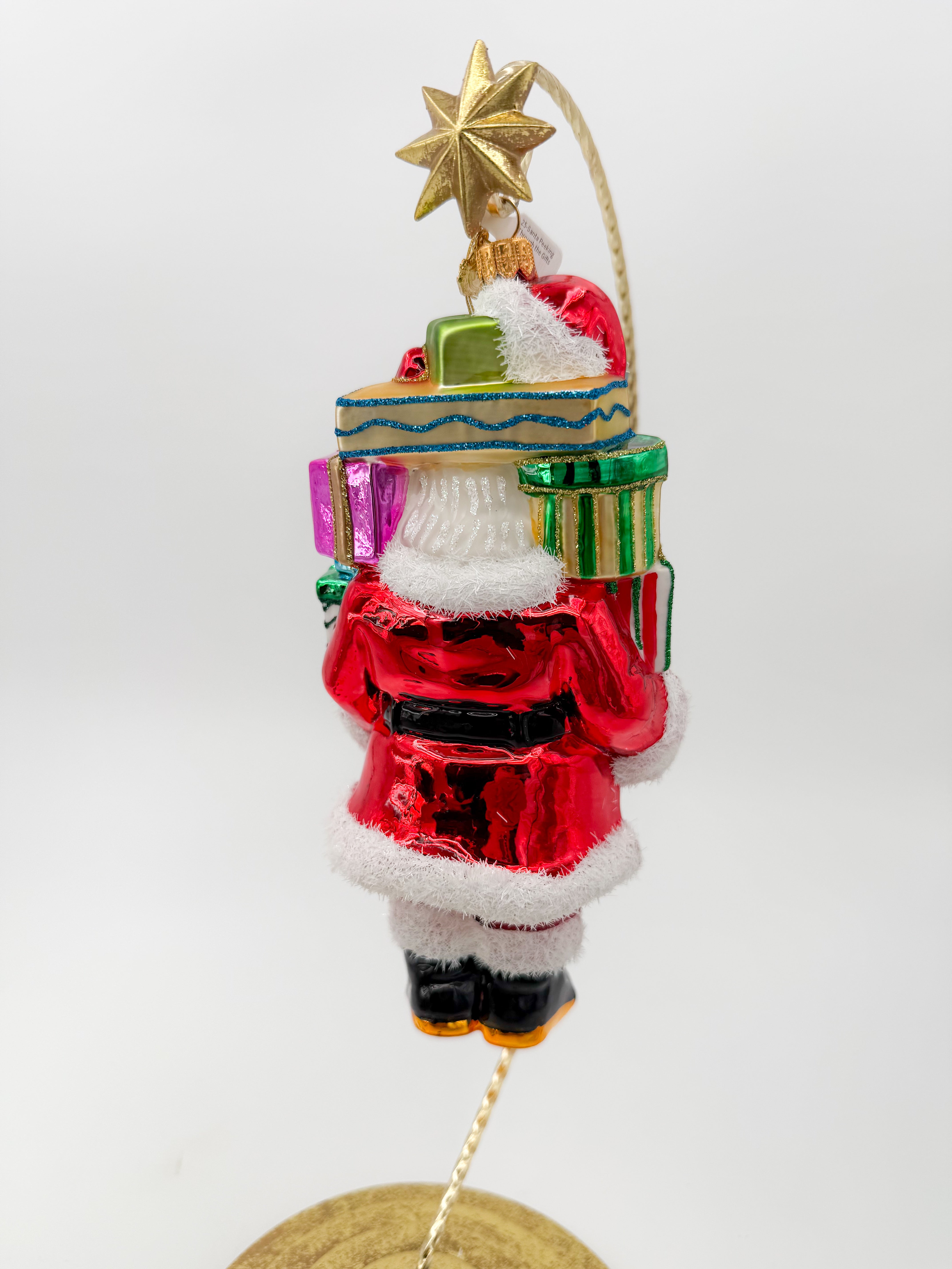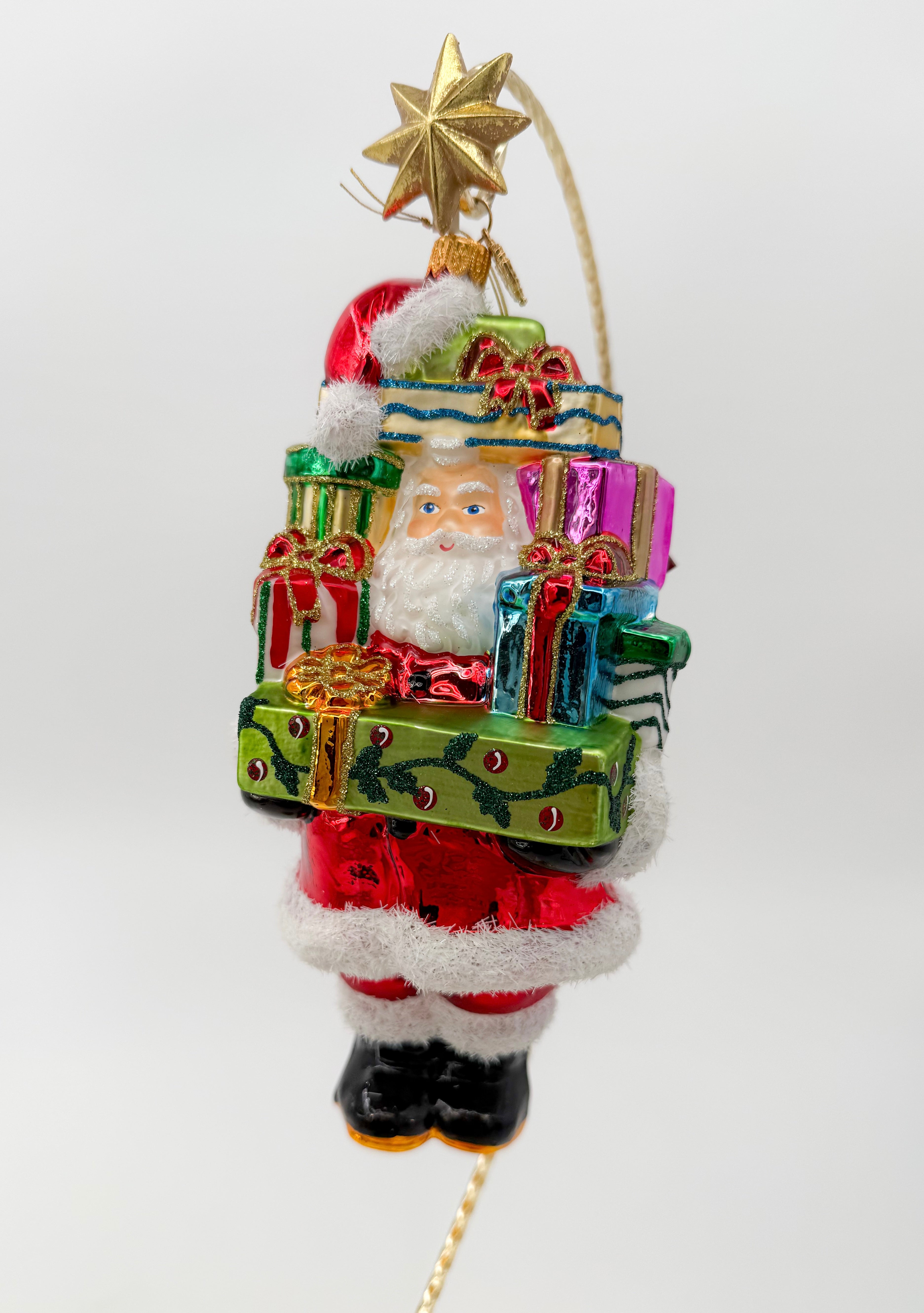 Add a touch of timeless elegance to your holiday decor with the 25-Santa Peeking Through the Gifts ornament. Hand-made by the Huras Family in Poland, this ornament is crafted with care and will add a unique charm to your Christmas tree. Bring the joy of the season into your home with this beautiful ornament.