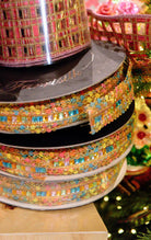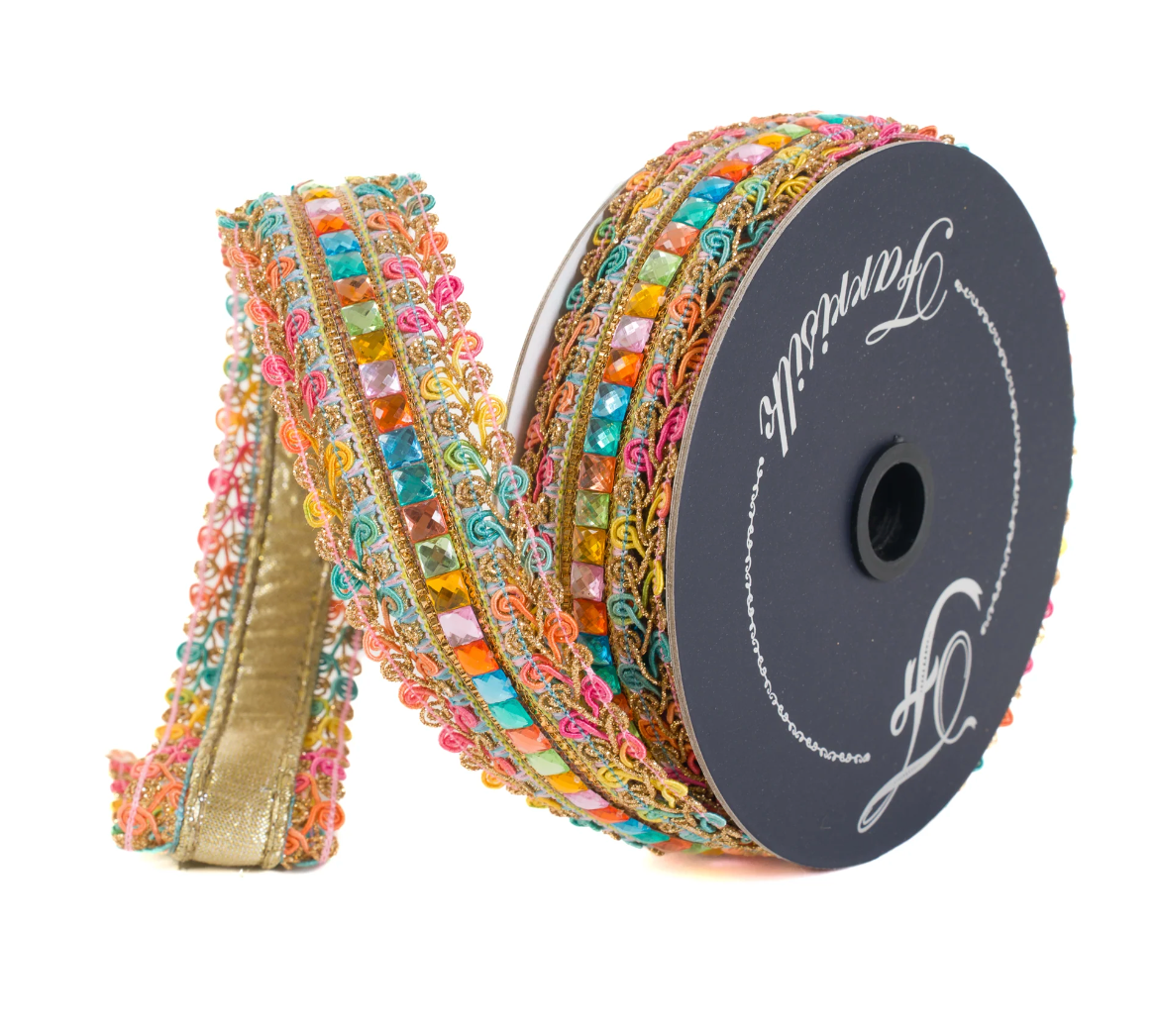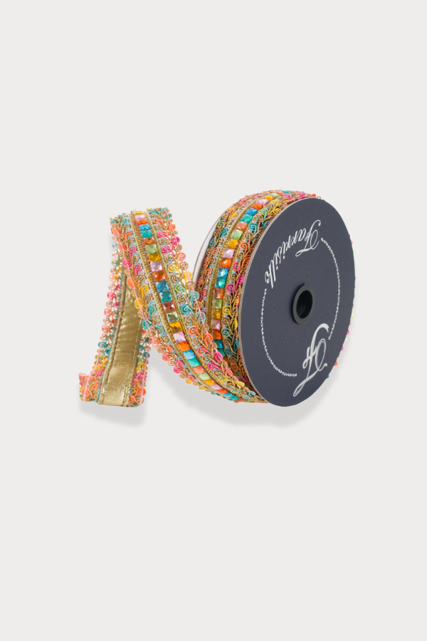 Add a splash of fun and color to your crafts with the Sherbert Swirls Ribbon. This 1.5" wired ribbon features a lively multicolor border and sparkling multicolor rhinestones down the center, perfect for brightening up any project with a playful twist. Its wired edges make shaping and styling a breeze, letting your creativity swirl freely!
