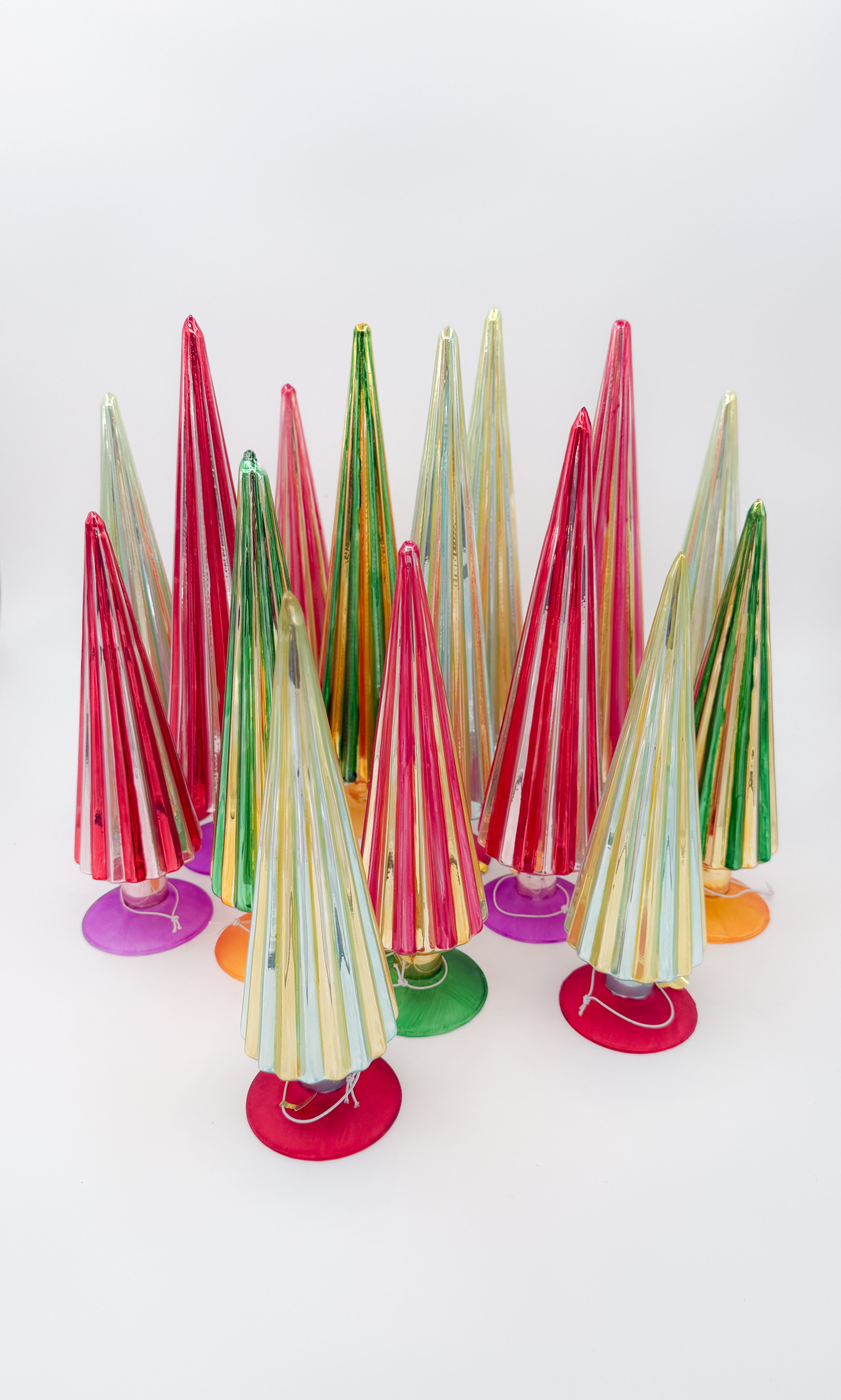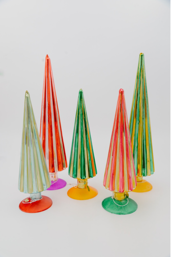 Celebrate the season with Cody Foster Carnival Trees! These glass trees feature a stripped cone shape and come in three sizes, each resting on a vibrant, differently colored base. Perfect for collectors, they add a playful and colorful touch to your holiday display or everyday décor.