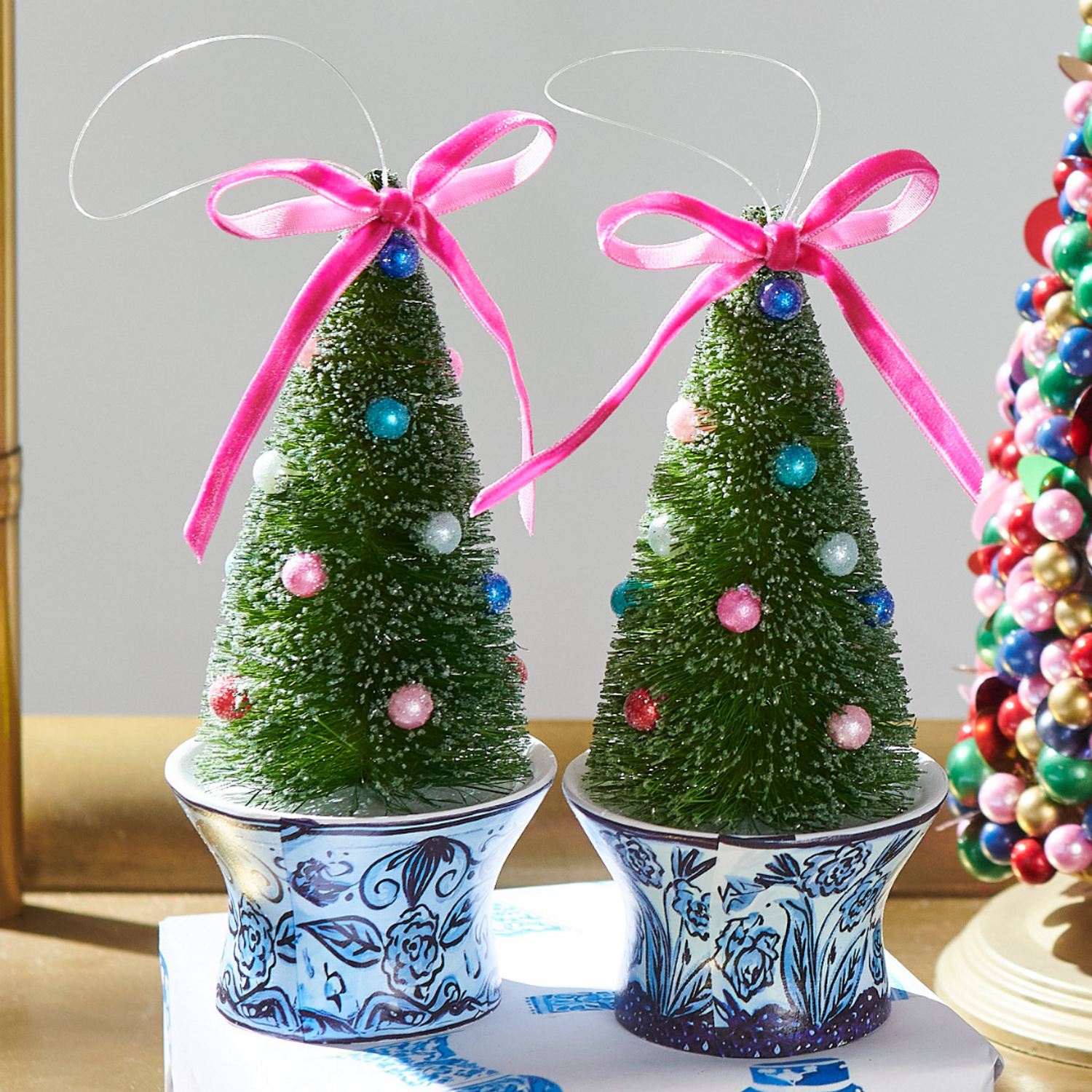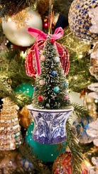 Enhance your holiday décor with this elegant 6" bottle brush tree set, nestled in a finely detailed Chinoiserie urn ornament.These trees add a refined touch of vintage-inspired charm and timeless sophistication to any tree!