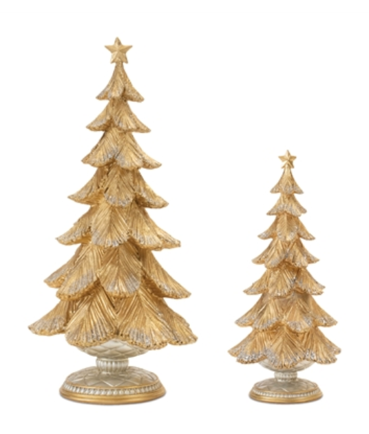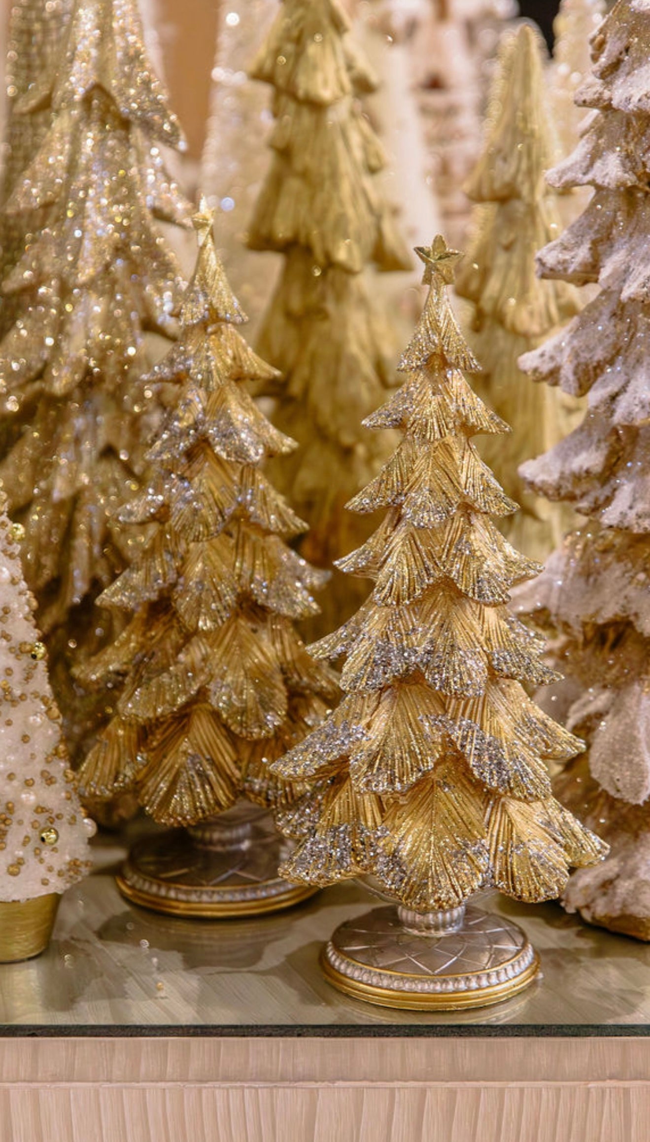 Celebrate the festive season with these charming gold resin Christmas trees! Available in two playful sizes, each tree sparkles with a golden finish and stands proudly on its own base. Perfect for adding a joyful holiday touch to your mantel, tabletop, or holiday vignette, these trees bring merry cheer wherever they twinkle.