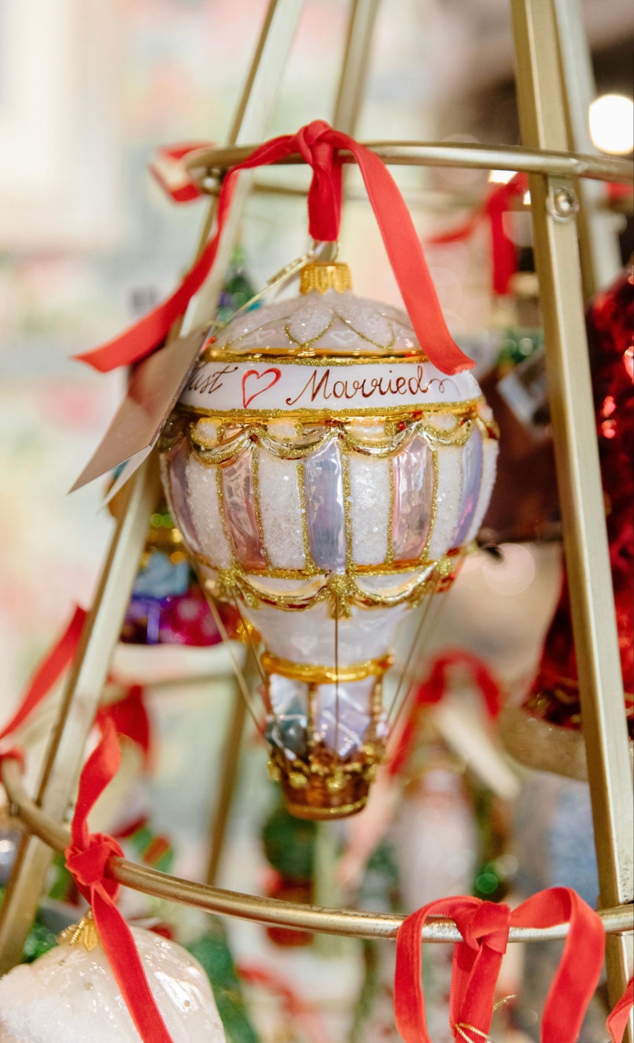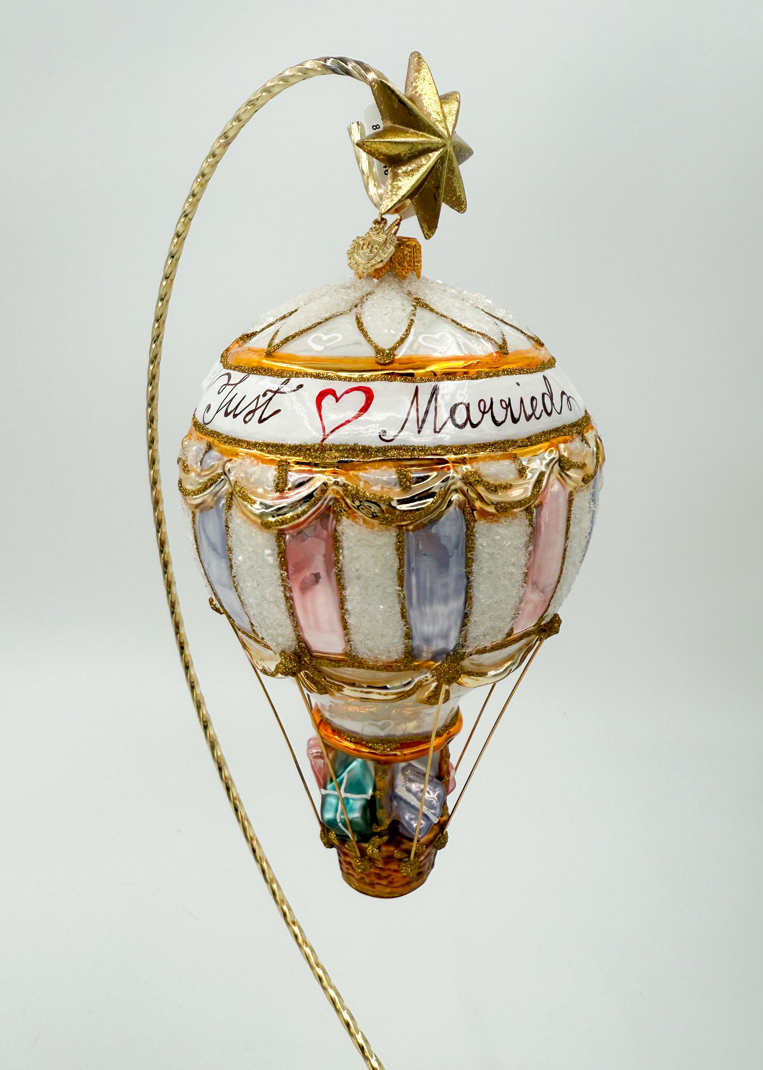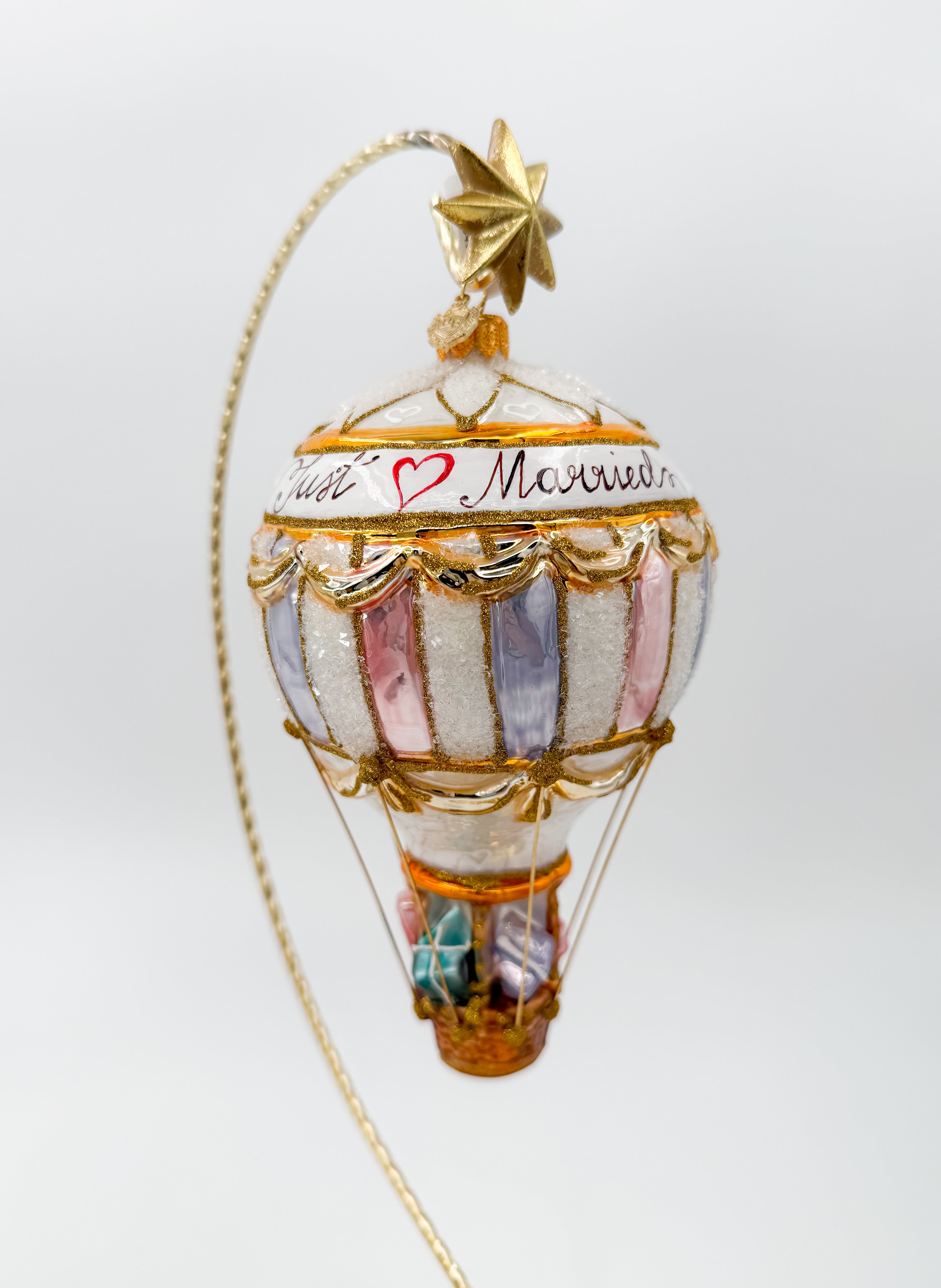 Expertly crafted, this 25-Wedding Hot Air Balloon ornament features a charming hot air balloon design with "just married" written across it. Made with high-quality materials, this ornament is a unique and meaningful addition to any wedding celebration. Celebrate your special day with this beautiful and timeless keepsake.