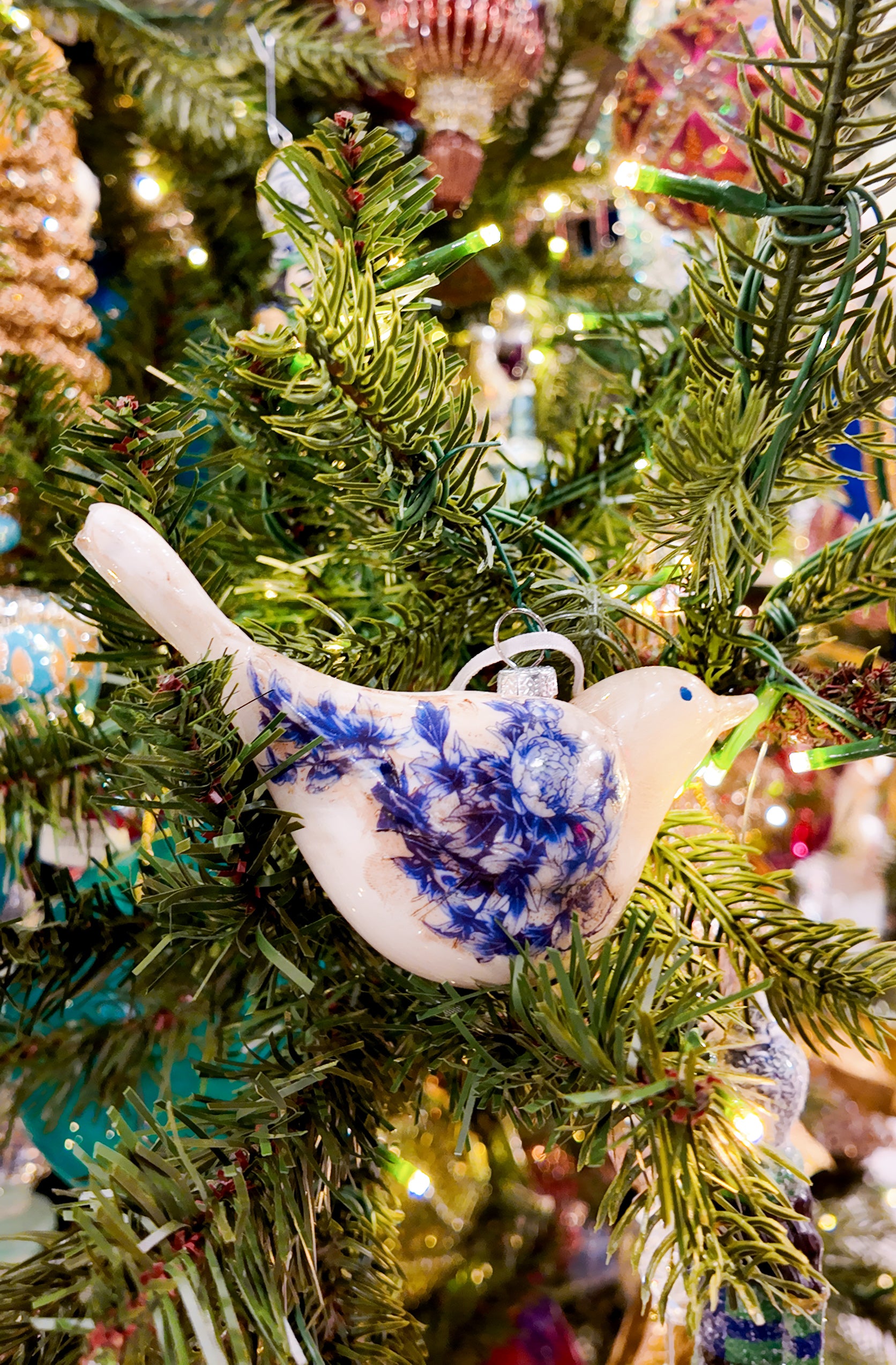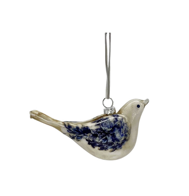 Bring a gentle flutter of holiday spirit with this 5.25-inch cream and blue glass dove ornament. Its delicate colors and graceful design add a peaceful, playful vibe to any Christmas tree or festive display. Spread joy with this charming little bird!