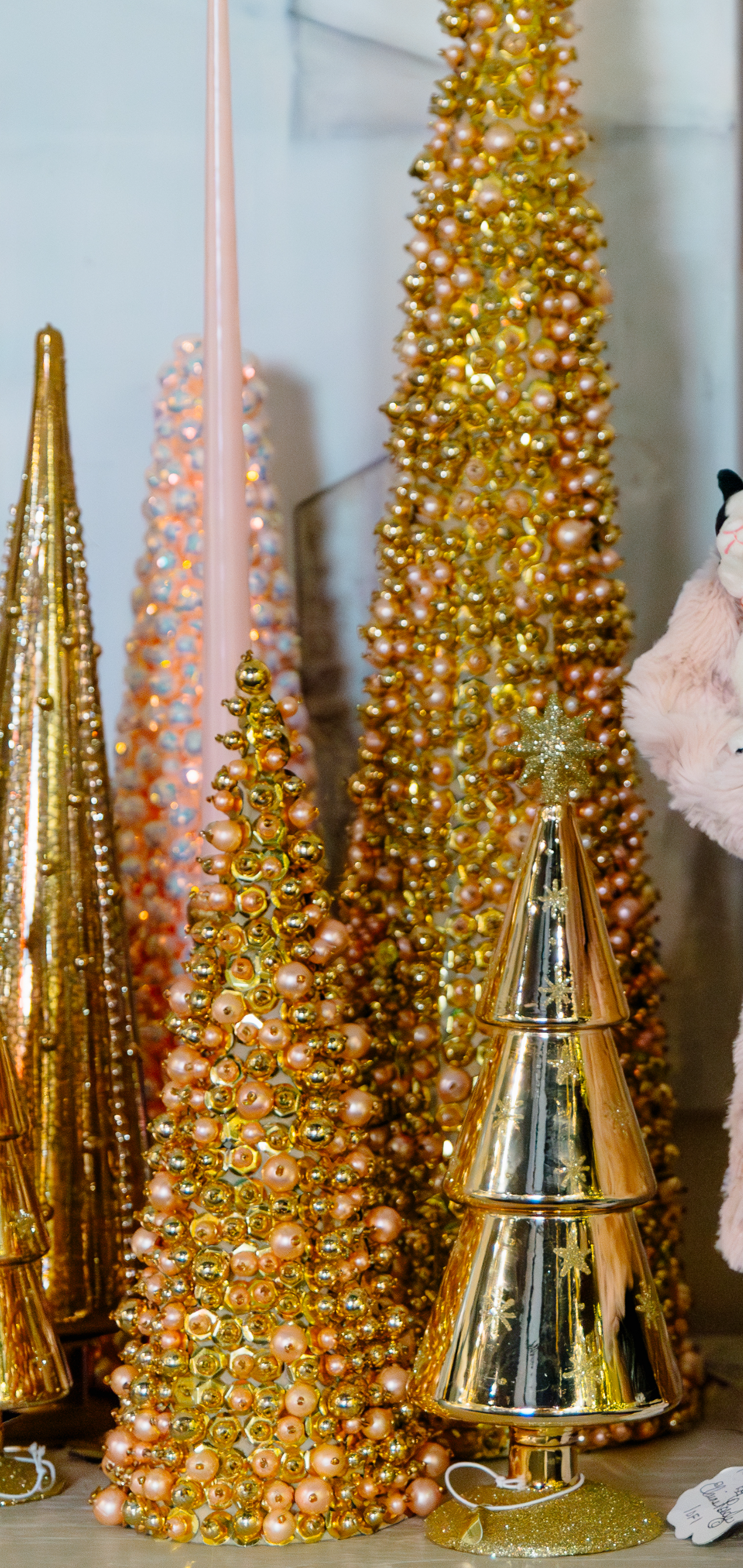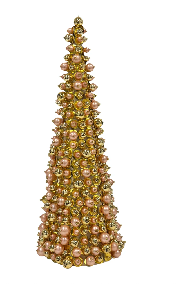 Add a touch of festive sparkle with these charming cone-shaped beaded trees in gold and light pink. Available in three sizes, they bring playful elegance to your holiday decor, perfect for tabletops or mantel displays. Celebrate the season with a whimsical twist that brightens any space!