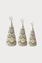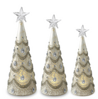 Light up your holiday display with these enchanting mercury glass trees! Each of the three silver-toned beauties sparkles with jeweled accents that catch and reflect light beautifully. Featuring built-in LED illumination and a convenient timer function, these trees create instant festive ambiance without the fuss. Perfect for mantels, shelves, or tabletops, they bring that coveted vintage-glam aesthetic to any room. Mix and match or display all three together for maximum sparkle and shine. Sold individually, so you can collect them all!