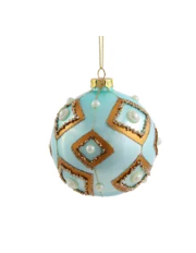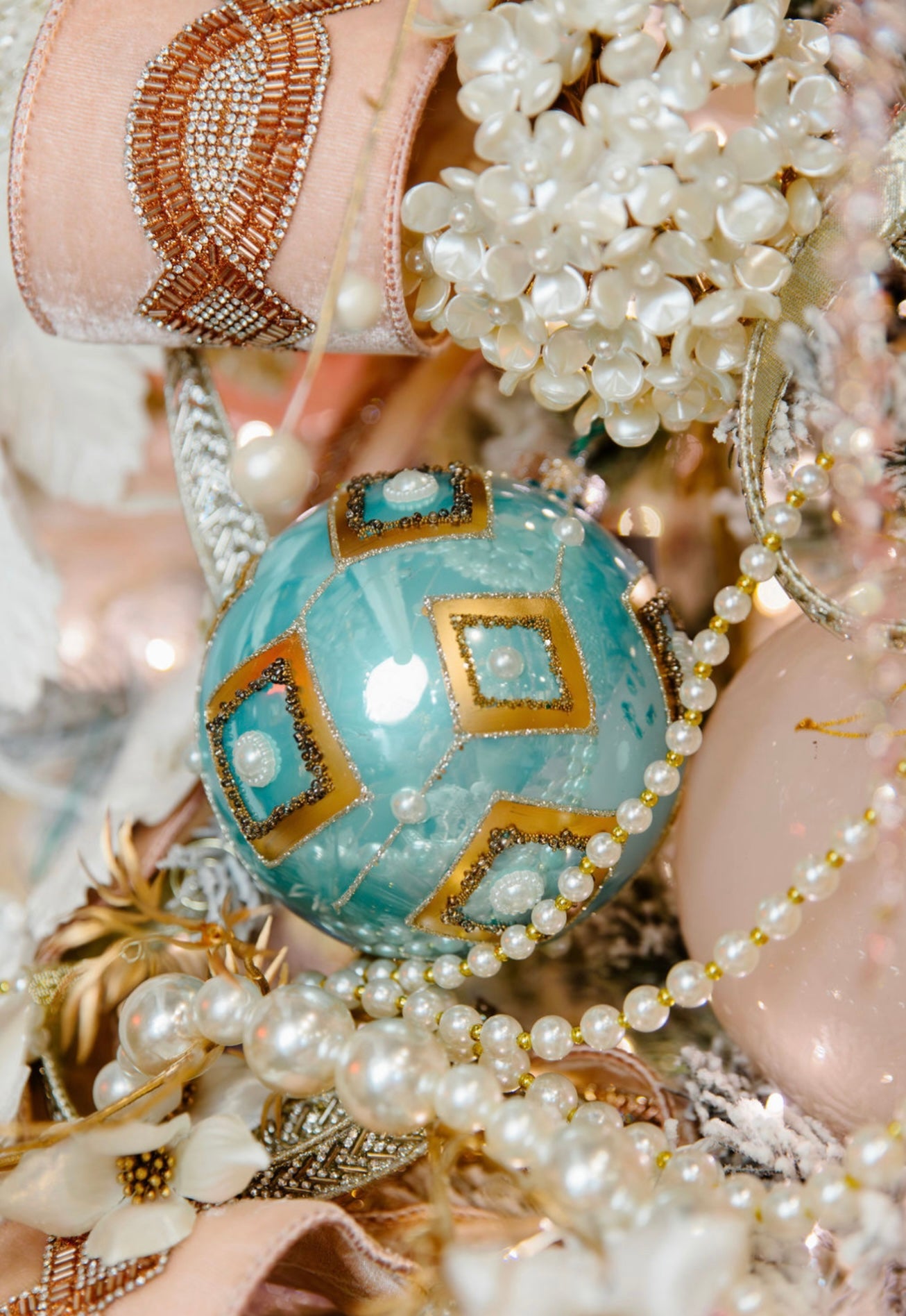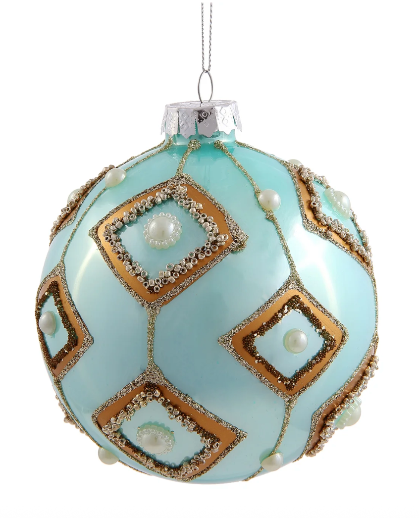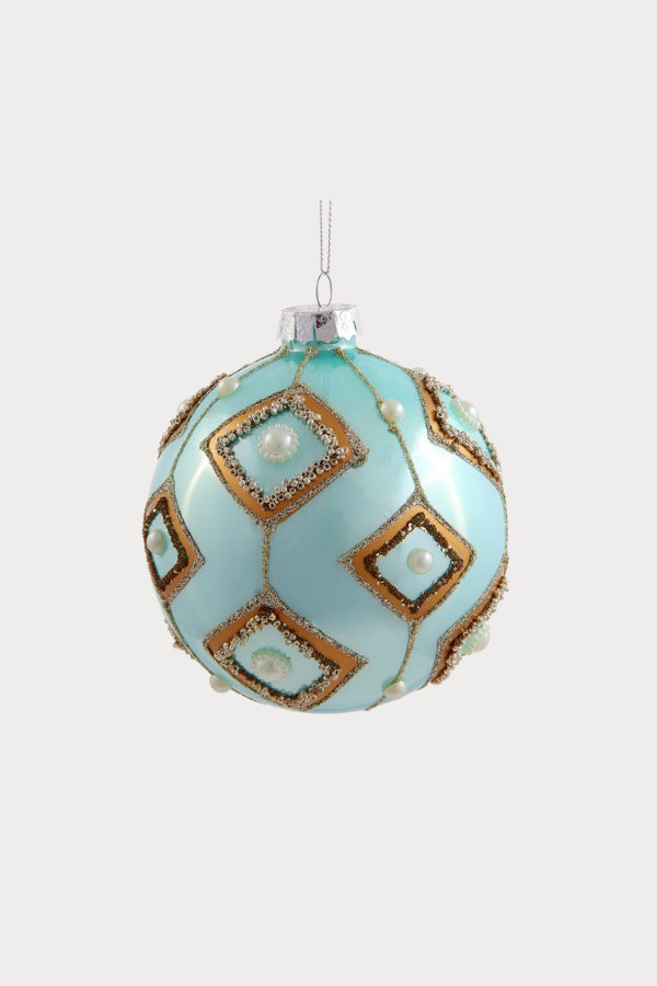 Elevate your holiday décor with the 25-Aqua Geo Pearl Ornament, showcasing an elegant geometric pattern adorned with delicate gold and brown beads. Pearl accents add a refined touch, creating a sophisticated blend of textures and colors that enhances any festive setting.