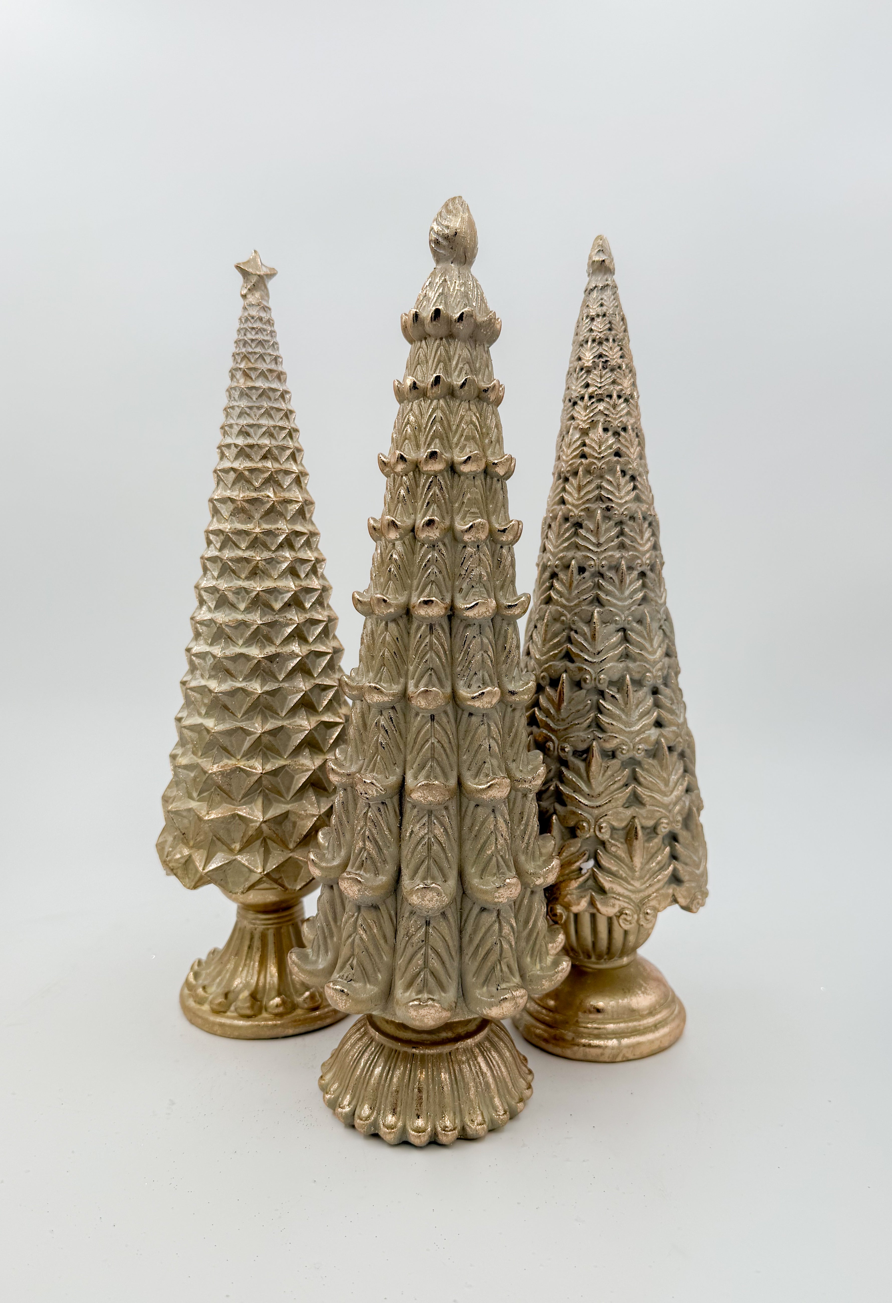 Add a festive sparkle to your holiday decor with this Gold Pattern Resin Tree. Standing 13.75 inches tall, it features three charming gold Christmas tree patterns, crafted from durable resin. Perfect for adding a playful touch of elegance and seasonal cheer to any room!