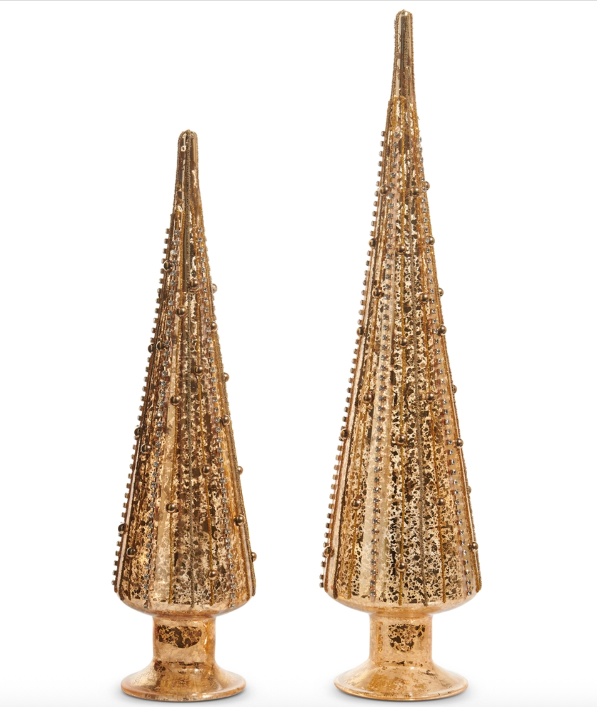 Add a touch of festive sparkle with this set of two Gold Mercury Glass Pearl Trees. Crafted from gleaming glass, these elegant trees feature shimmering silver and grey tones, perfect for brightening up your holiday décor. Standing at 18" and 15" tall, they bring playful charm and shimmering delight to any mantel, table, or shelf this season.