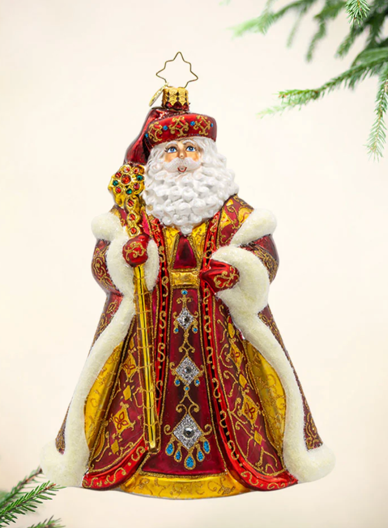 A Regal Masterpiece: Celebrate 40 Years of Christopher Radko with Years In The Making Nick. This stunning ornament showcases the brand's signature attention to detail, with intricate patterns, shimmering accents, and a regal color palette.