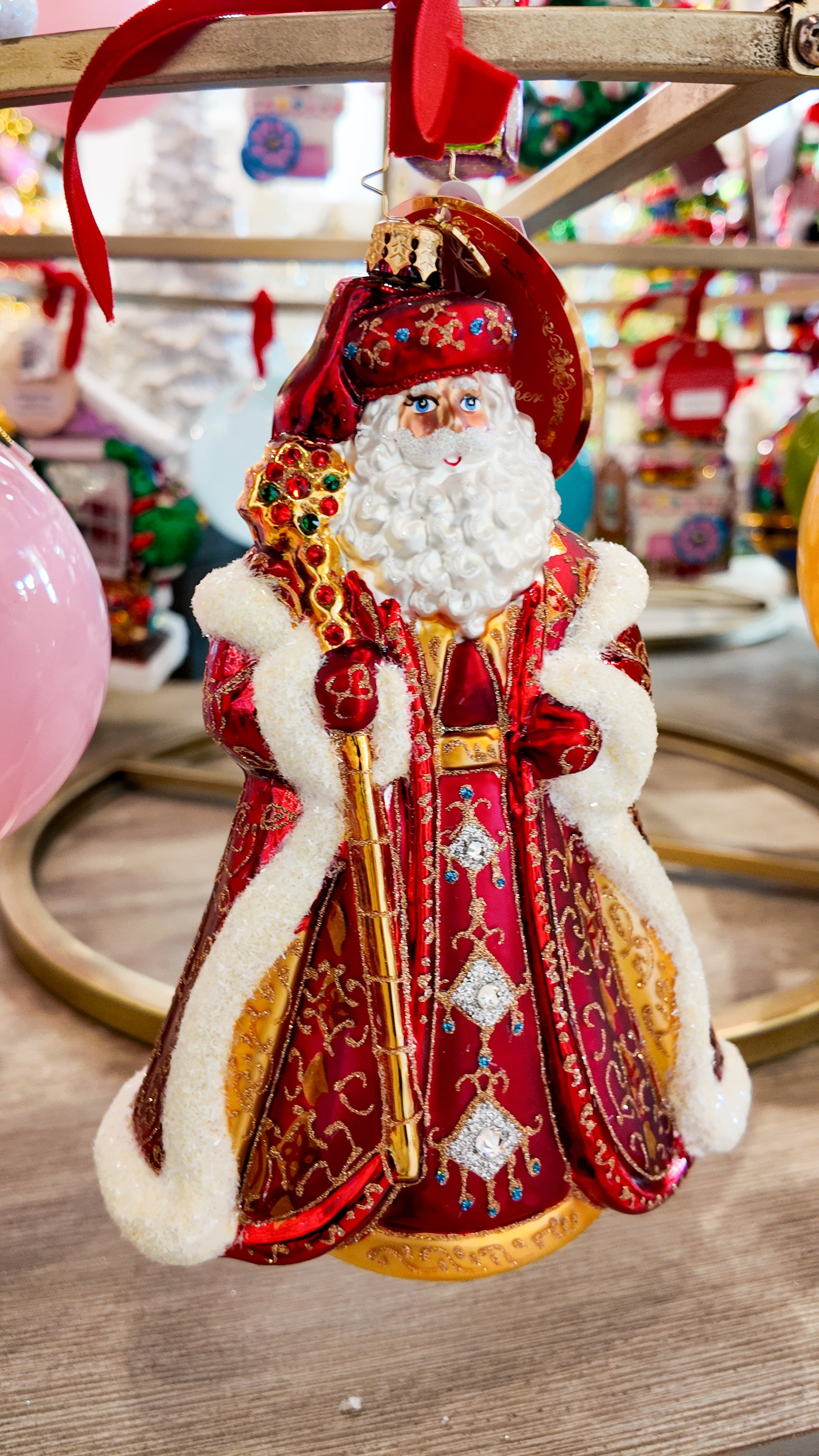 Admire the majestic figure of Santa, adorned in a deep satin red coat and a shimmering gold staff. The intricate patterns on his coat and the attached gems add a touch of opulence and elegance. His beard blends seamlessly with his regal attire, creating a harmonious and sophisticated look.