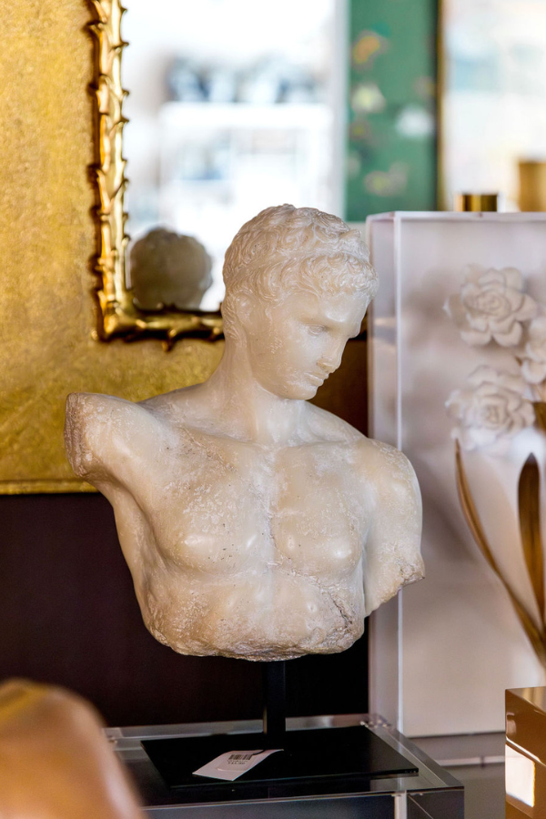 The Greek Bust on Metal Base evokes the unmatched craftsmanship of Grecian artisans from long ago. Crafted from composite, the piece depicts an intricately detailed head and torso, showcasing stunning attention to the sophisticated human form. The piece rests atop a slender base of black metal, complementing the sculpture’s stark white tones.