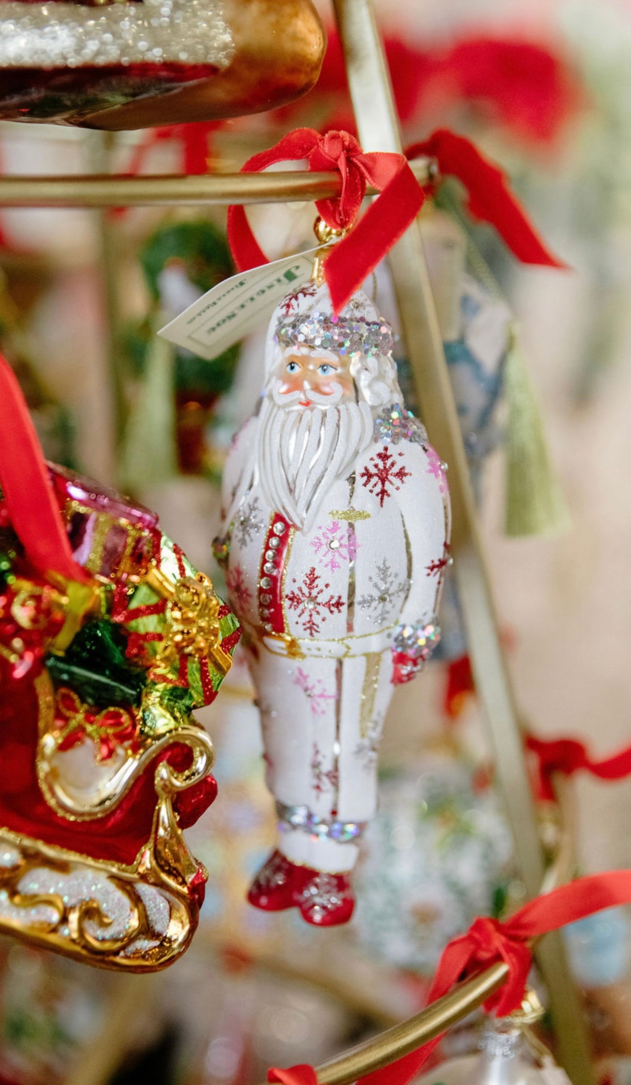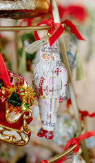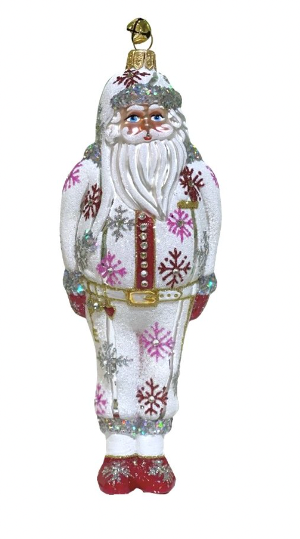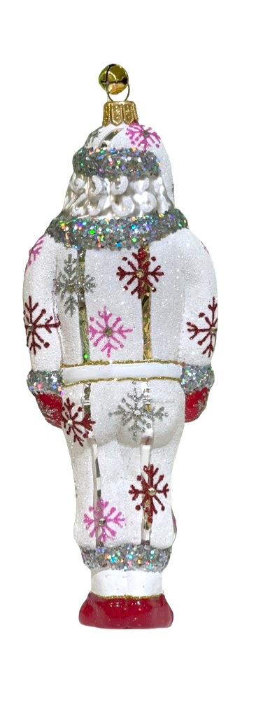 Celebrate the holiday season with the Baba Frost Ornament, featuring a meticulously hand-painted Santa Claus dressed in elegant red and pink glitter snowflake-patterned pajamas. This refined decoration adds a touch of festive charm and artistry to any space, making it a timeless piece for collectors and holiday enthusiasts alike.