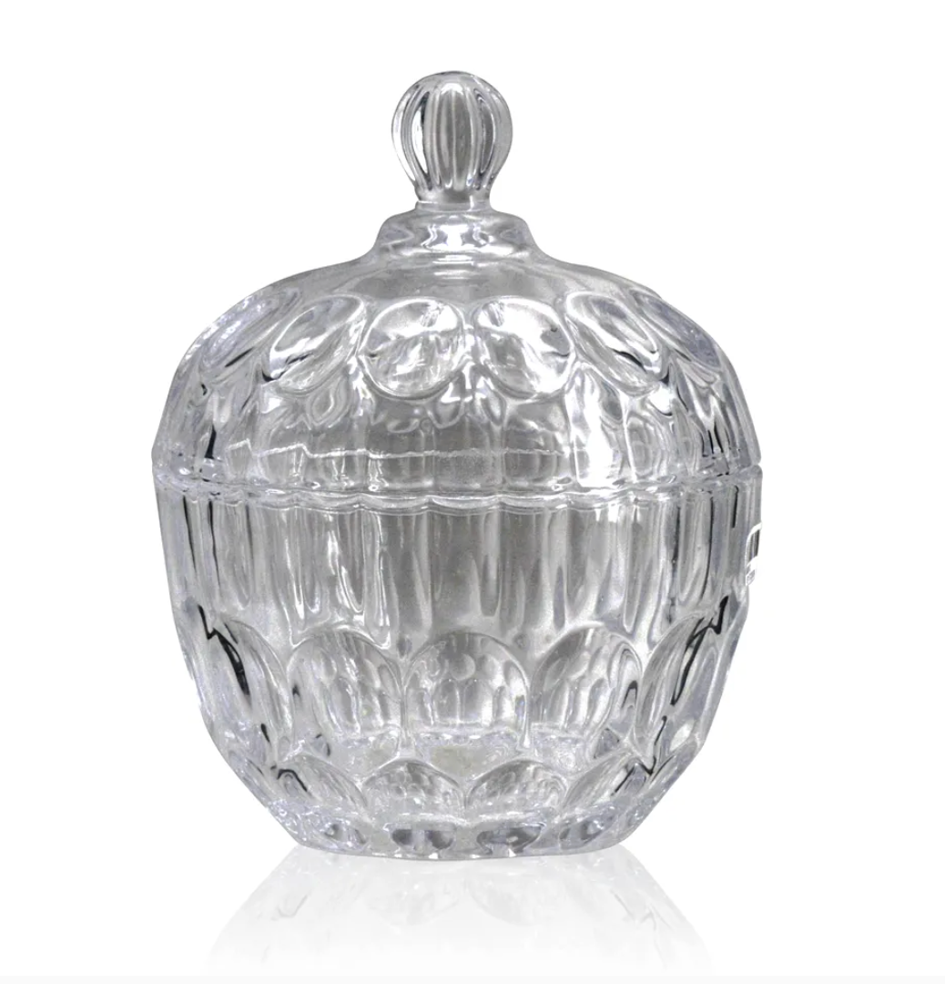 This vintage-inspired lidded jar features clear, faceted glass that adds an elegant touch to any space. Measuring 6 inches in diameter and 7.5 inches tall, it is versatile enough to serve as a candy jar, bathroom vanity container, or stylish storage solution. The secure lid keeps contents fresh while showcasing your items beautifully. Perfect for adding a refined, classic charm to your home décor.