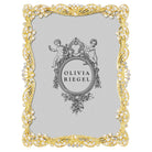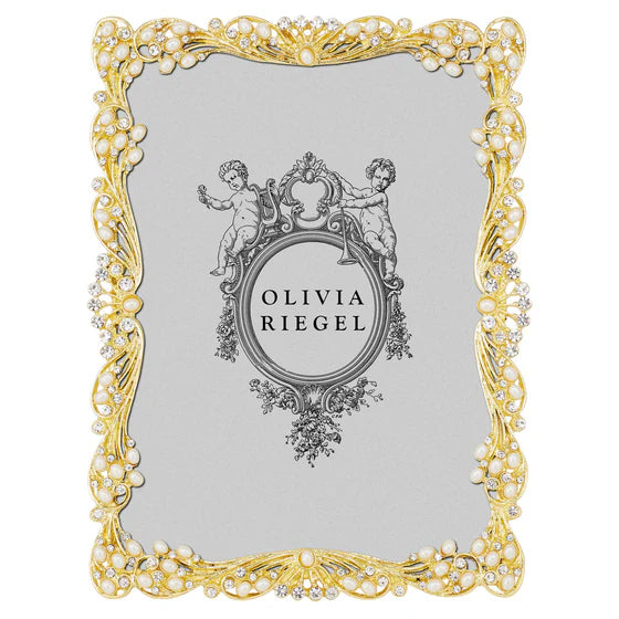 Gold finished pewter filigree work adorned with hand-set clear European crystals and cultured freshwater pearls. Elegant champagne moiré silk back, with easel designed for vertical or horizontal placement. Tarnish resistant. Signature luxury gift box included.