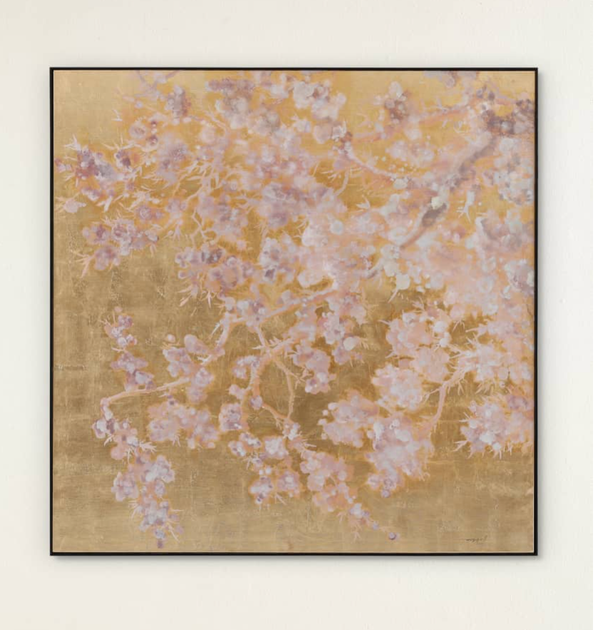 Indulge in luxury with Teng Fei's Gilded Canopy. This oil painting on canvas features a stunning gilded canopy, embellished with delicate strokes of gold leaf. Admire the intricate details of the pink flowers in this exclusive piece of art. Elevate your home decor with this elegant masterpiece.