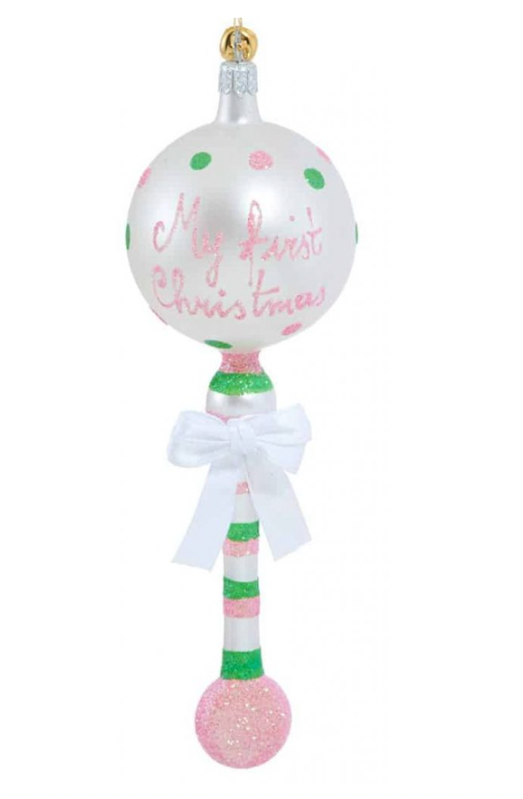 Celebrate a baby's inaugural holiday with elegance using this hand-painted rattle ornament. Beautifully decorated in soft pink and green glitter dots, it offers a refined festive touch. When shaken, it emits a gentle rattle sound, creating a charming sensory experience. Perfect for commemorating a first Christmas with timeless style.