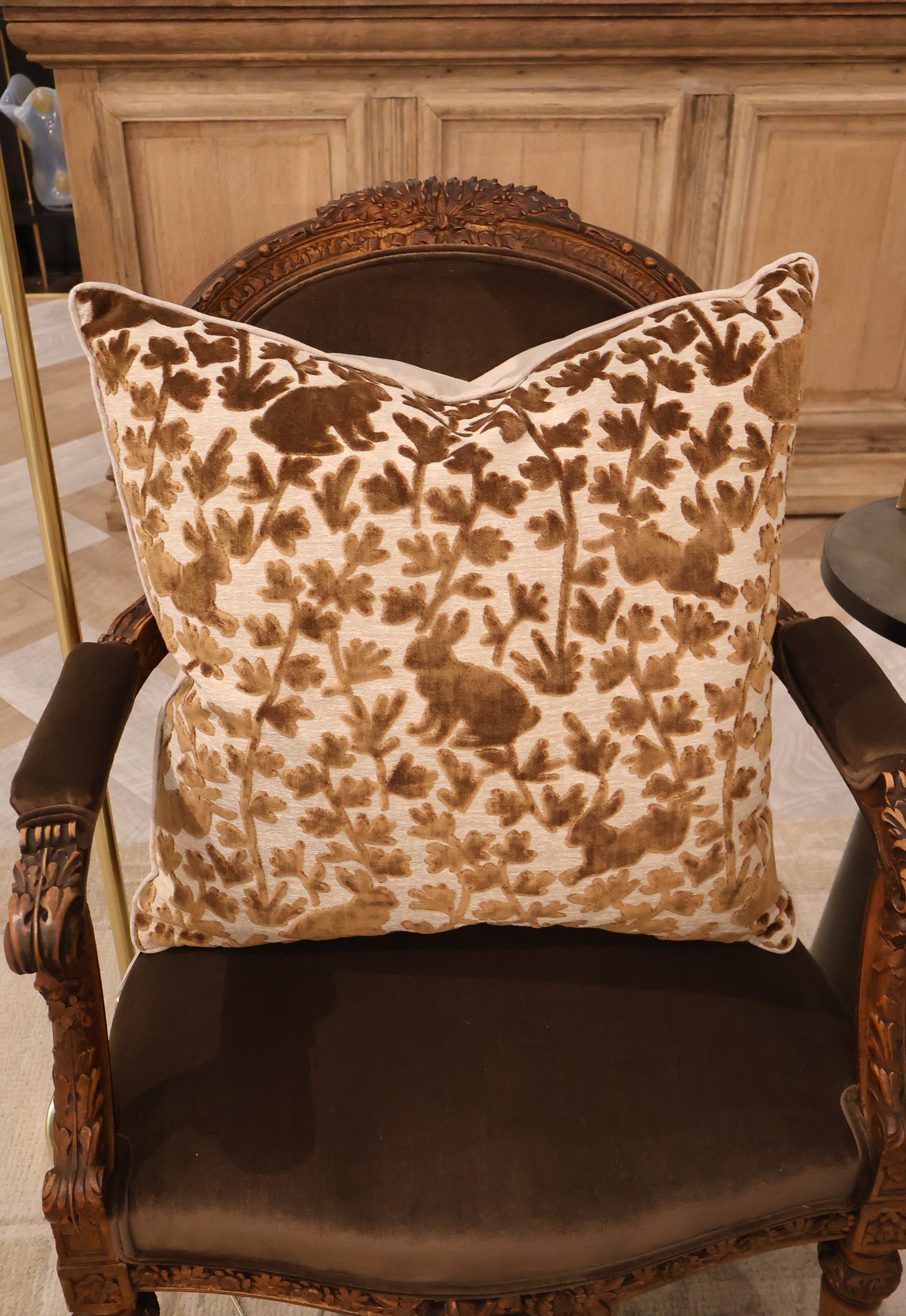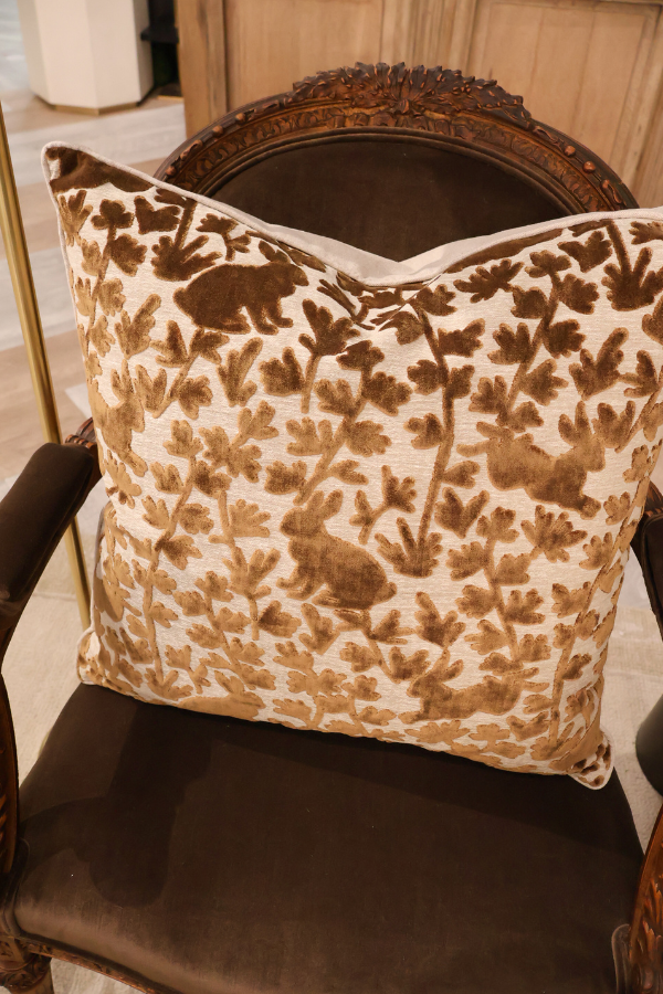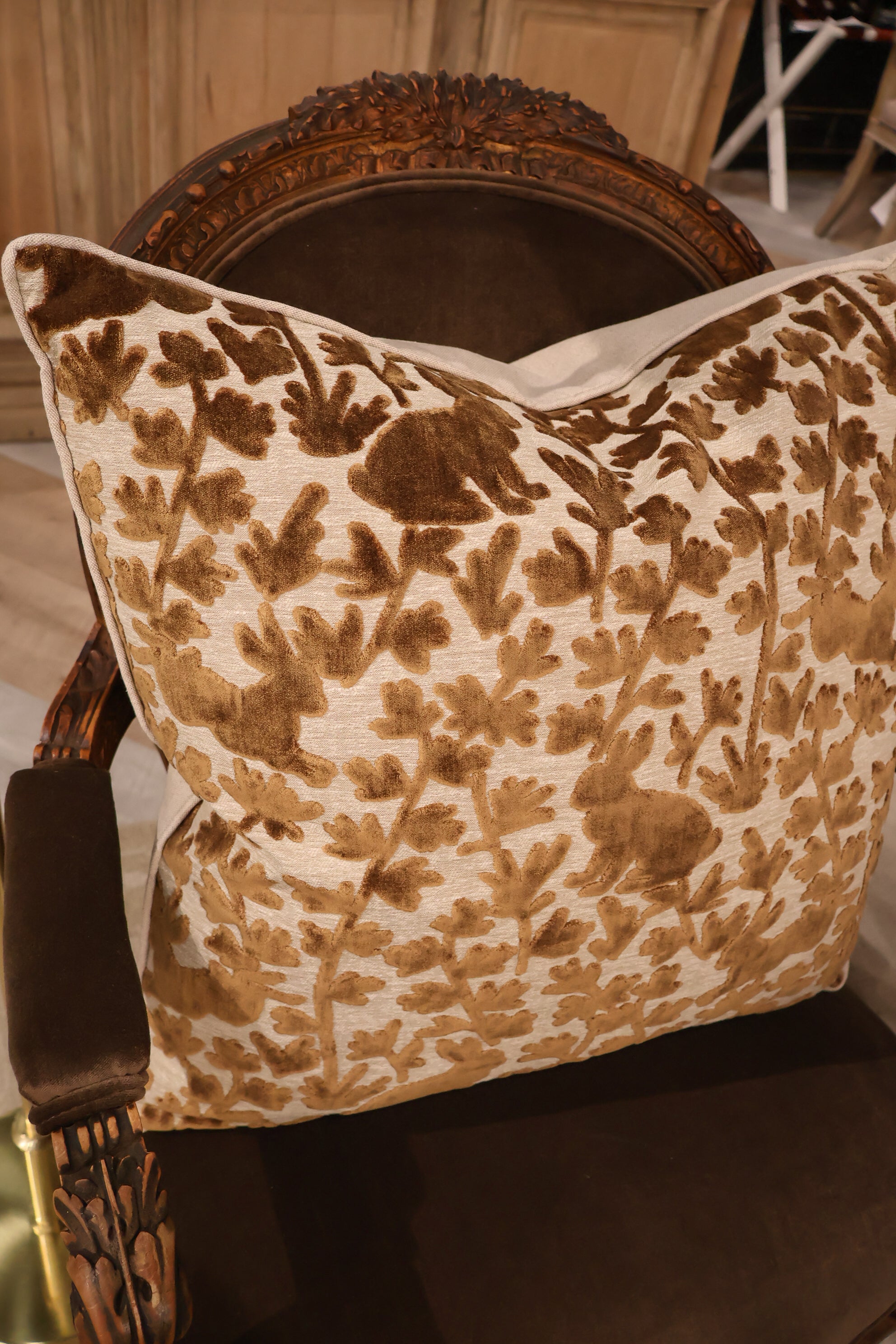 Introducing The Astrid Pillow - a refined addition to your home. This beige throw pillow showcases elegant dark ochre velvet patterns accented with delicate rabbit motifs. Elevate your space with its refined design and luxurious texture.