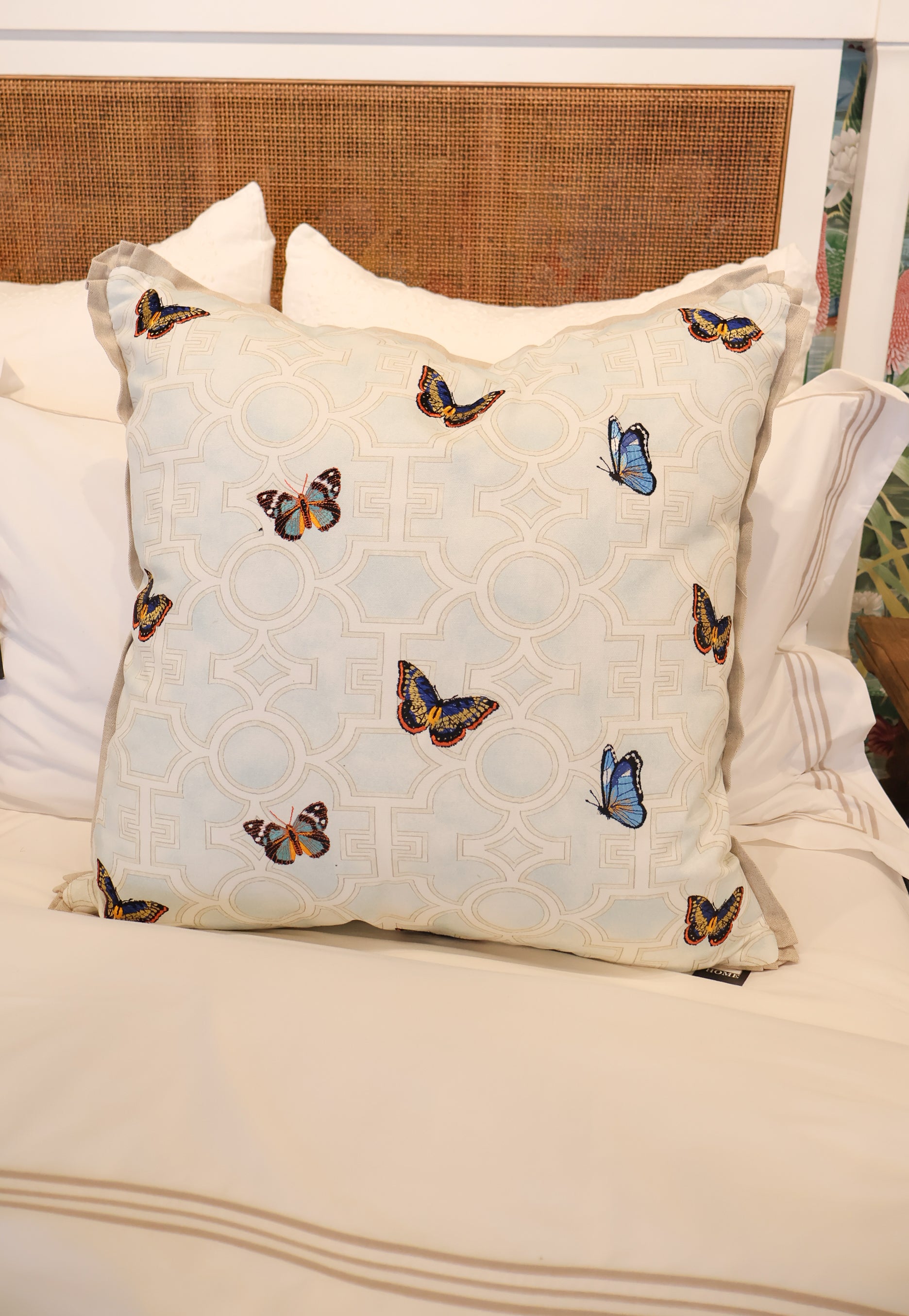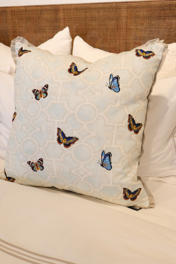 Elevate your living space with The Fern Pillow. This refined throw pillow features delicate butterfly motifs in a dreamy cloudy blue color, adding a touch of elegance to any room. Perfect for adding a subtle pop of nature and sophistication.