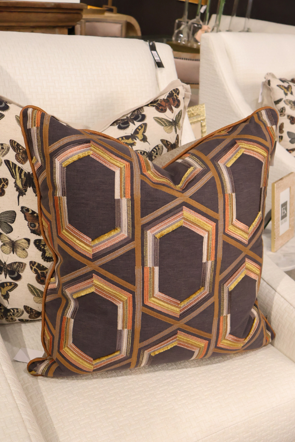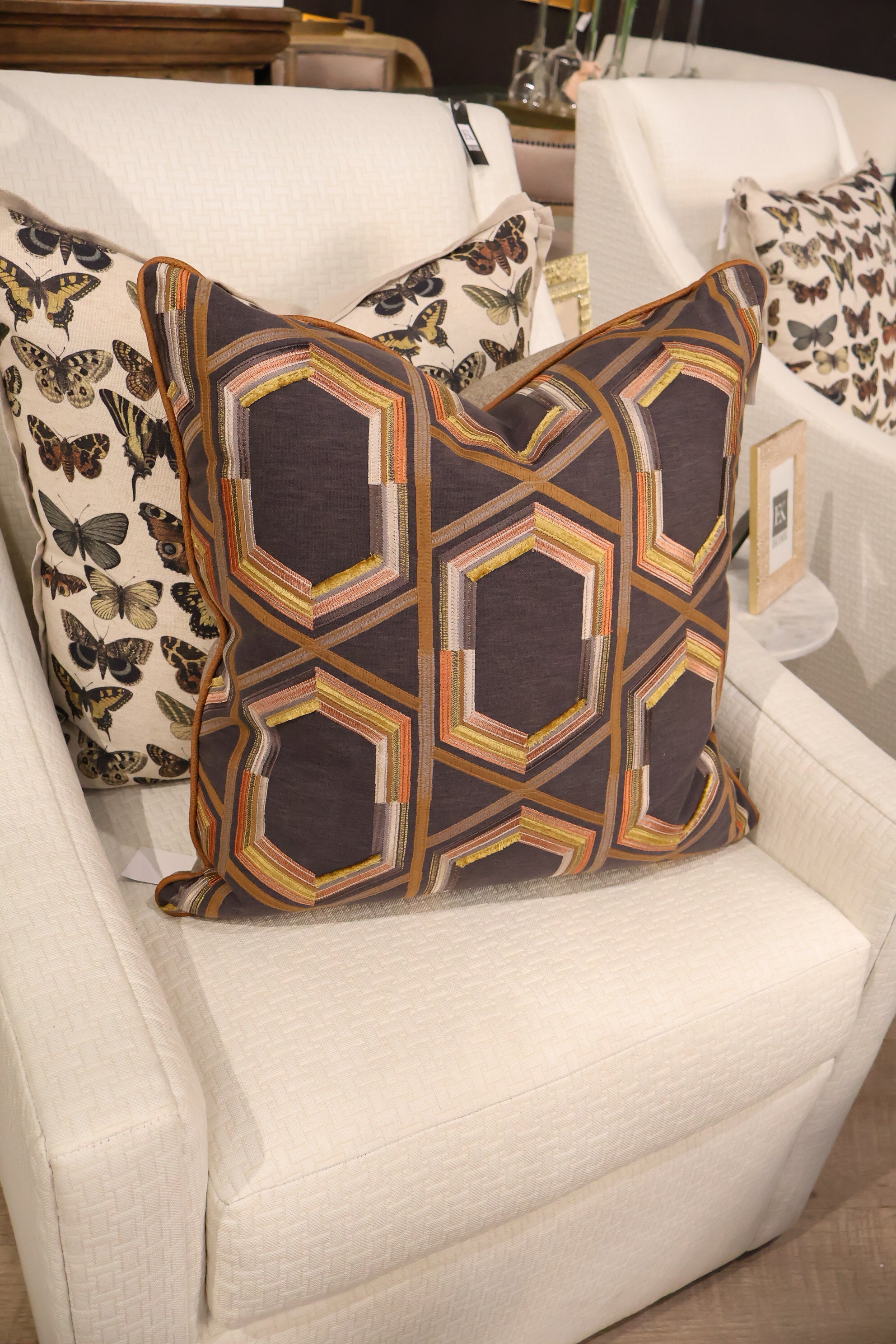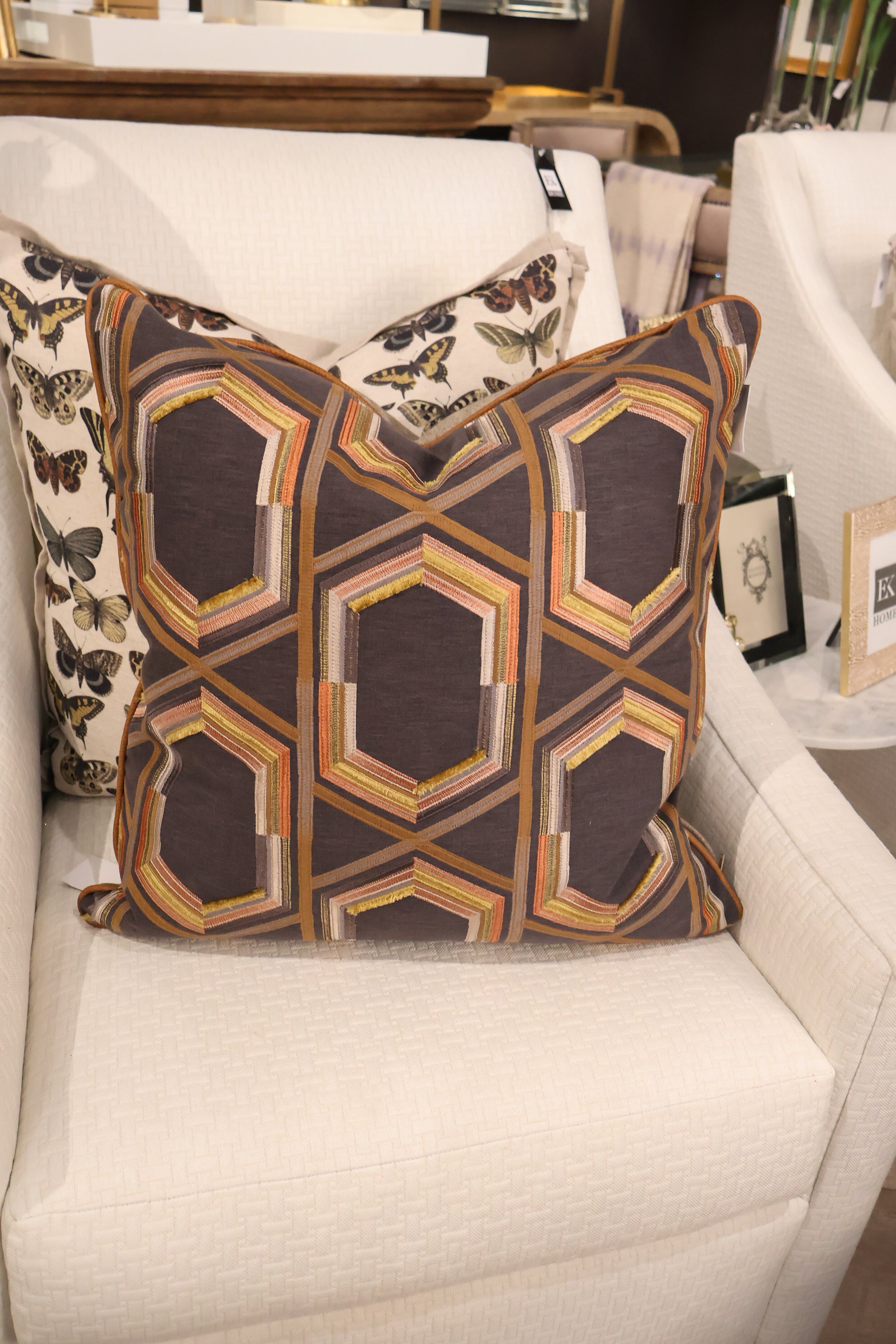 Introducing The Lorraine Pillow, a sophisticated addition to any space. This luxurious throw pillow boasts a stunning geometric pattern, accented by a sleek leather trim, adding a touch of elegance to your decor. Elevate your home with this exclusive piece, crafted to add both style and comfort.