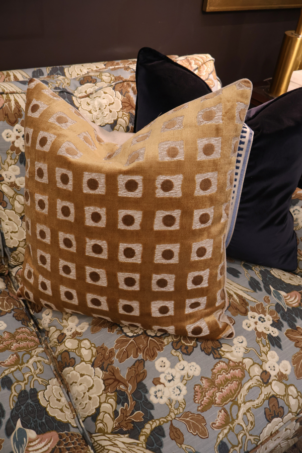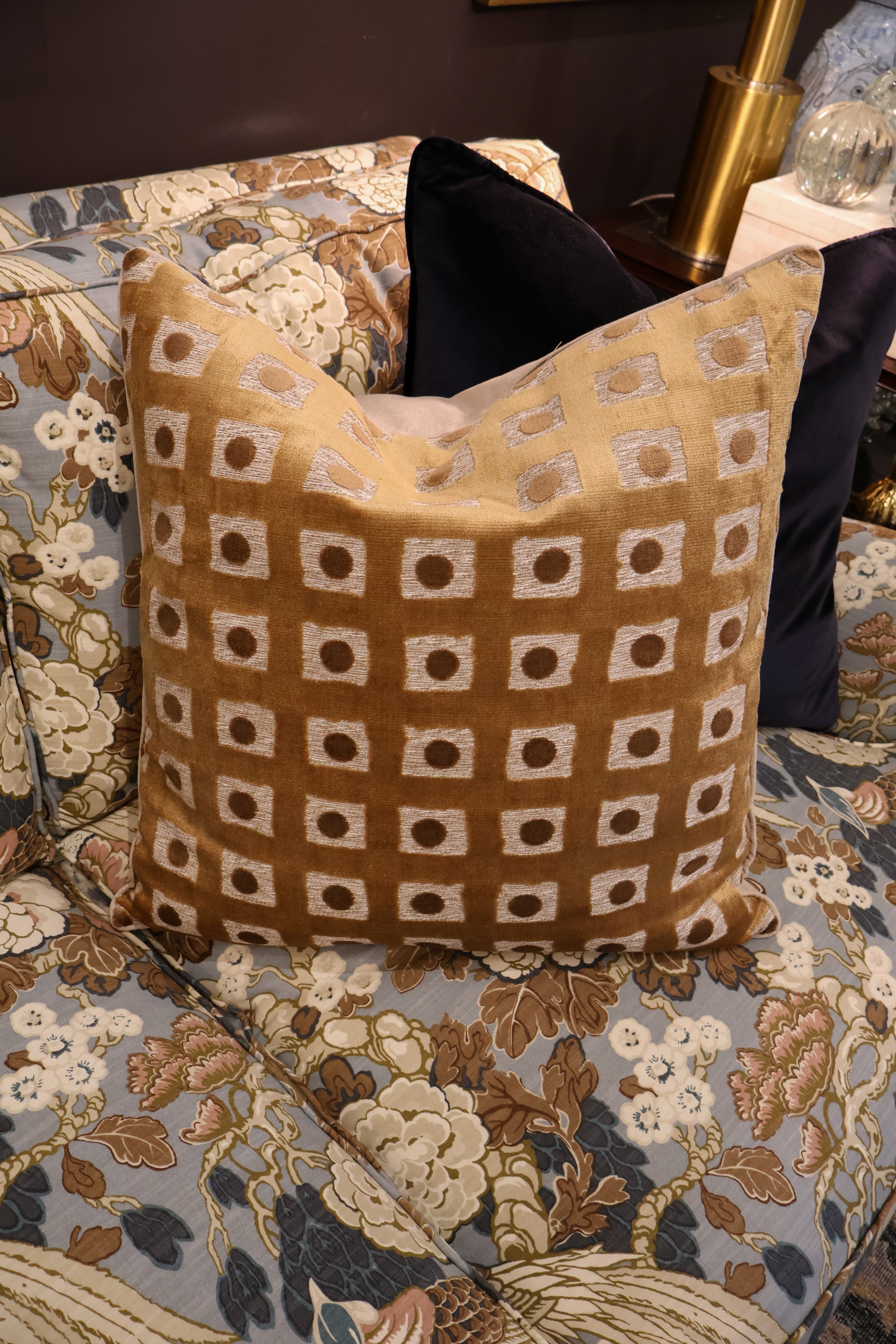 Indulge in luxury and elevate your living space with The Rosalie Pillow. Adorned with a stunning velvet squares and dots pattern in burnt gold and brown, this throw pillow exudes sophistication and elegance. Unleash your inner style icon and add a touch of opulence to any room with this exclusive accent piece.
