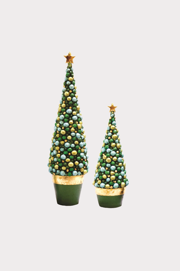 Add sparkle and charm to your holiday décor with this playful Bolsi Cone Tree. Hand-painted with attention to detail, its resin build is sturdy yet lightweight, perfect for tabletop or mantel displays. Adorned with glittering ball ornaments, it brings festive cheer and a touch of whimsy to any room. Let this cheerful tree brighten your celebrations with its unique, handcrafted flair.