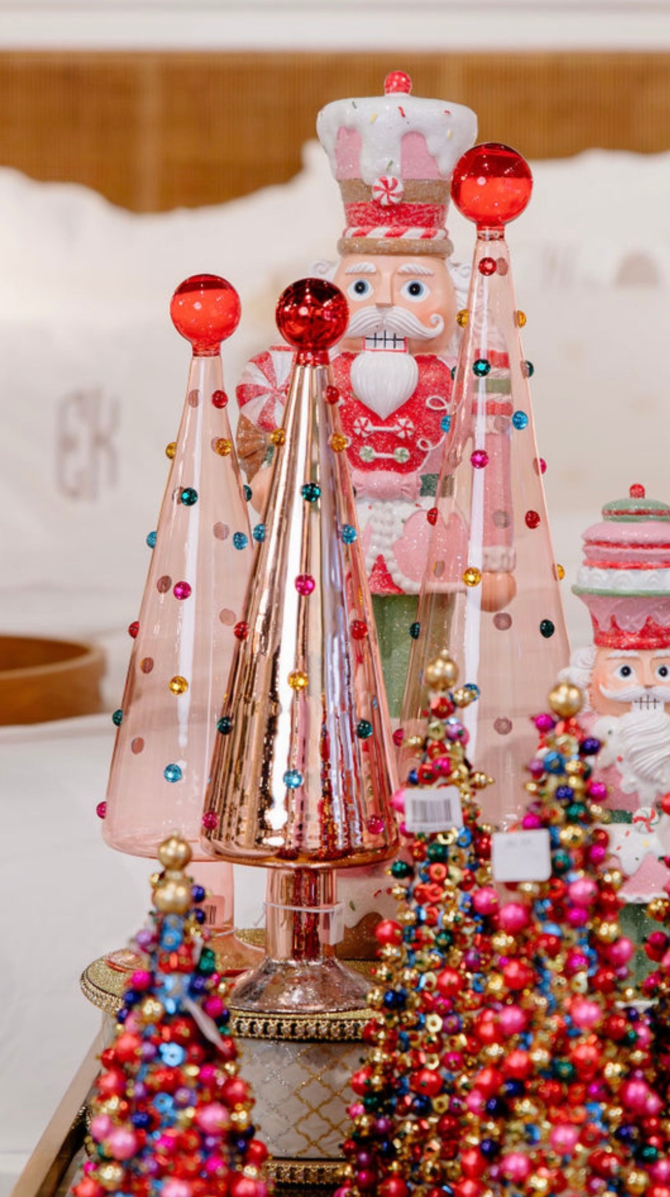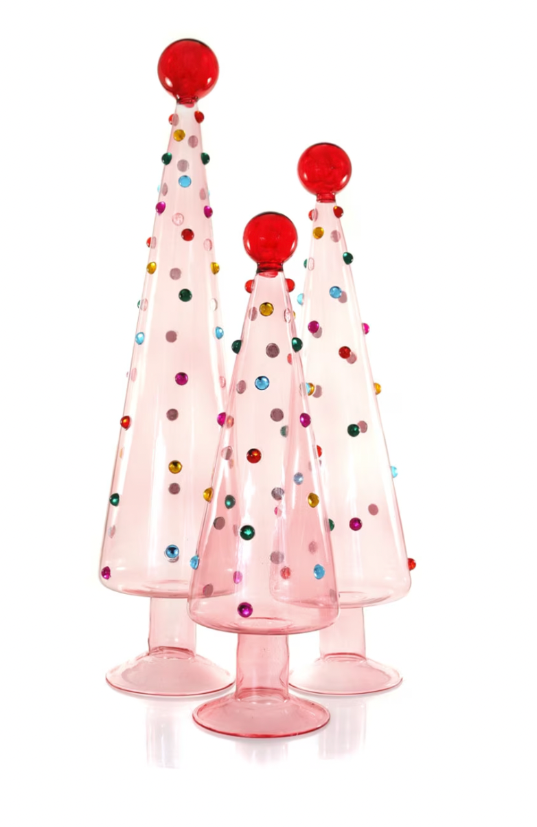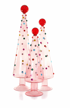 Add a splash of festive fun with this pink translucent glass tree, available in 12.5", 15", or 18" sizes. Adorned with colorful glass dots and topped with a cheerful red finial, it brings a playful charm to any holiday display. Perfect for brightening up your space with a touch of whimsy!