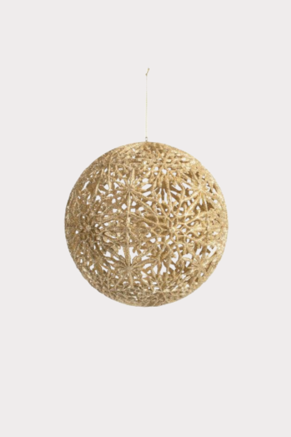 Inspired by the serene beauty of freshly fallen snow, the Oversized Gold Metallic Globe Snowflake Ornament adds an elegant glow to your seasonal décor. Measuring 8.5 inches, its shimmering gold finish captures light beautifully, creating a refined sparkle that enhances any setting. This ornament brings a touch of nature's quiet charm indoors, perfect for elevating your holiday ambiance with sophisticated warmth.