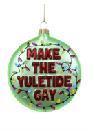 Make the holidays merry and bright with the Make The Yuletide Gay ornament! This charming glass decoration features a festive green hue and the playful phrase "make the yuletide gay". Spread joy and laughter this holiday season with this quirky and cheerful addition to your tree.