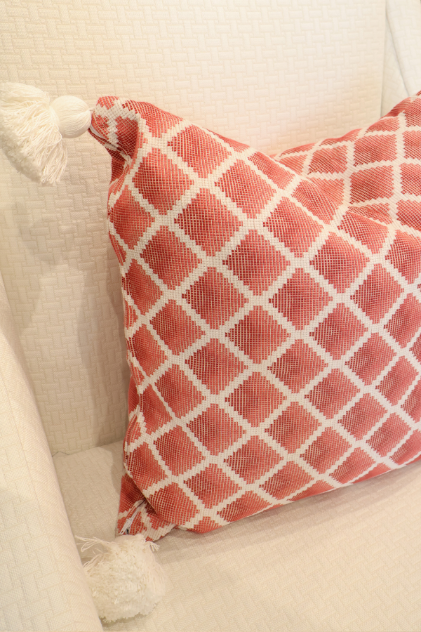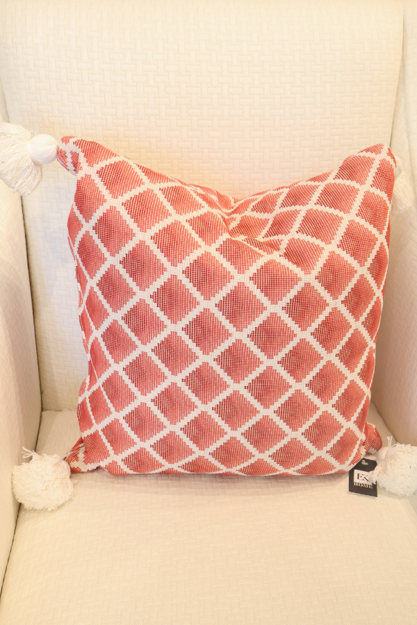 Introducing "The Myrtle" Coral Trellis Custom Small Square Pillow - the perfect addition to your home decor. This pillow features a beautiful coral trellis design and delicate tassels, adding a touch of elegance to any room. Create a cozy and stylish space with the help of "The Myrtle" pillow.
