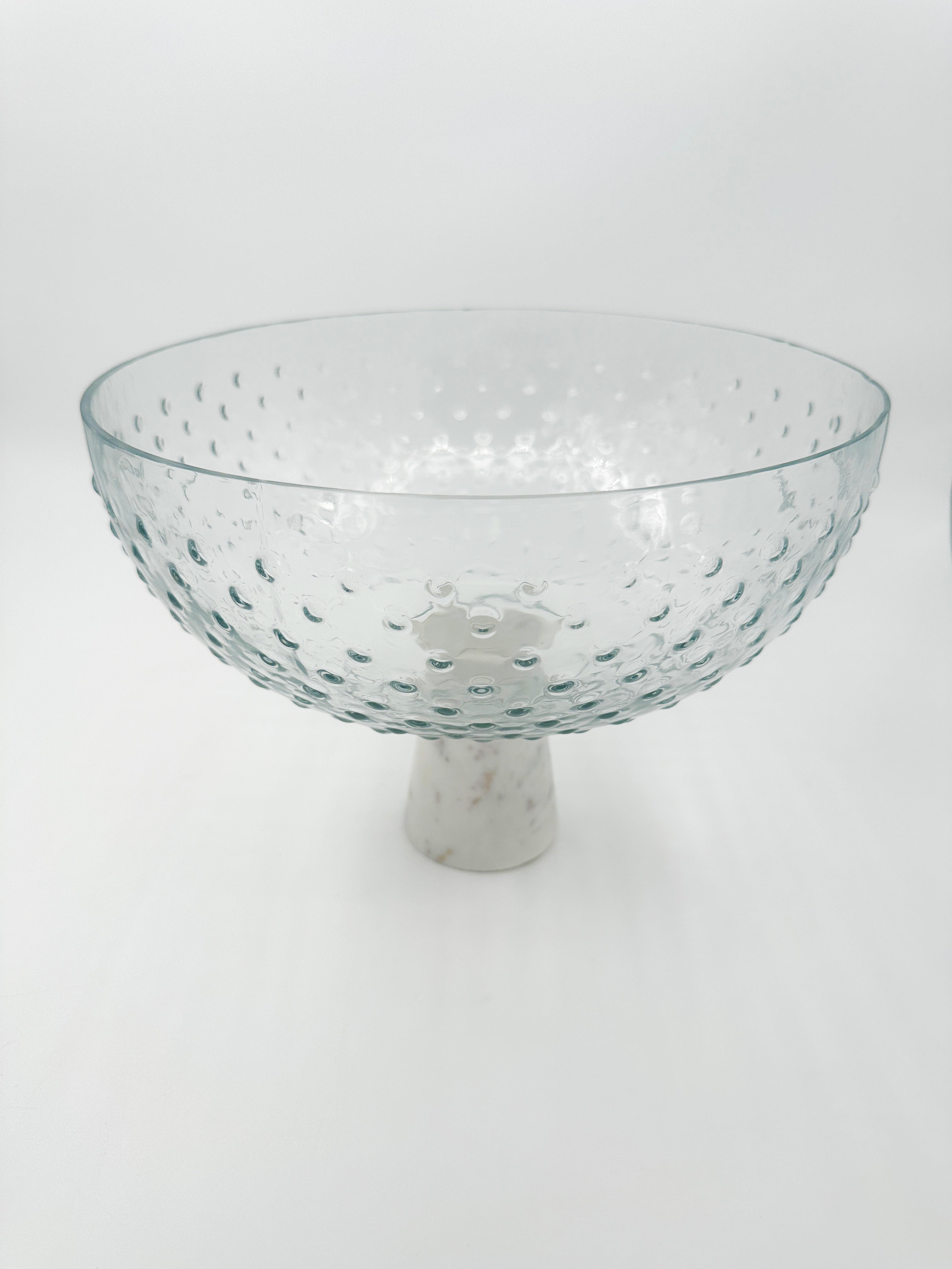 Elevate your décor with the January Bowl, featuring a clear studded glass bowl that beautifully contrasts with its sleek white marble stand. This expertly crafted piece combines tactile texture and natural stone elegance, making it a sophisticated centerpiece or functional accent for any modern space. Its sturdy marble base ensures stability, while the studded glass adds a refined visual and tactile element, perfect for serving or display.