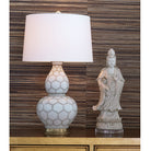 This double gourd shaped lamp features a honeycomb pattern in brown on white porcelain, the lamp is accented with brass hardware and solid brass base. Crystal ball finial.