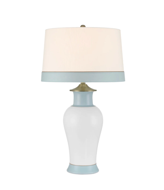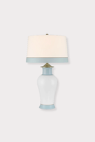 The Kora Blue Table Lamp exemplifies refined elegance with its classic baluster silhouette and meticulous detailing. Artfully crafted from porcelain, this sophisticated piece features tailored stripes in celadon and brown glazing against a pristine white background. Note the thoughtful design continuity—a delicate brown line separates the blue base from the white body, elegantly echoed on the shade. Complementary brushed brass elements, including the cap and round finial, complete this timeless lighting statement that enhances any distinguished interior.