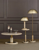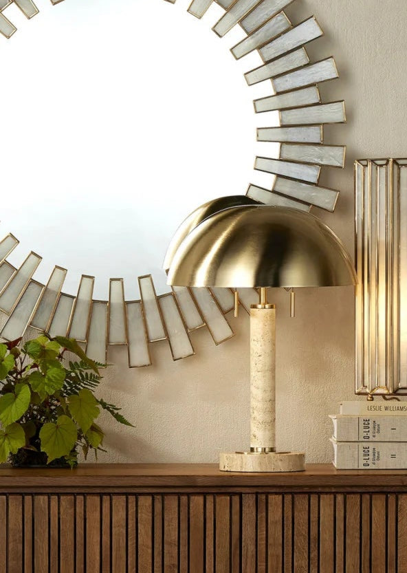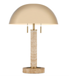 Introducing the luxurious Miles Table Lamp, featuring a stunning combination of natural brass and travertine. Standing at 21.75 inches and with a diameter of 15.75 inches, this lamp adds a touch of elegance to any room. Elevate your space with its sophisticated design.