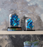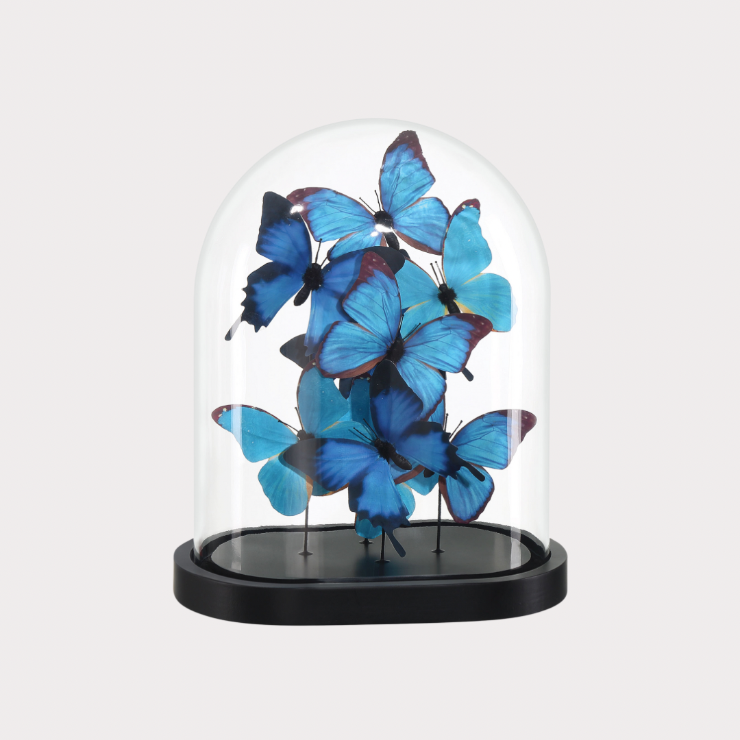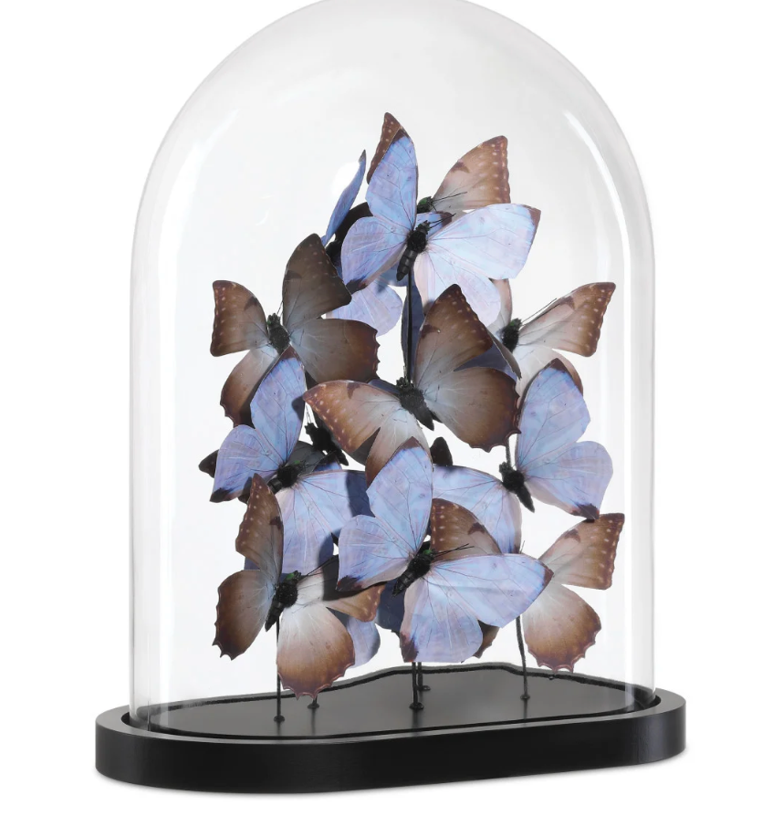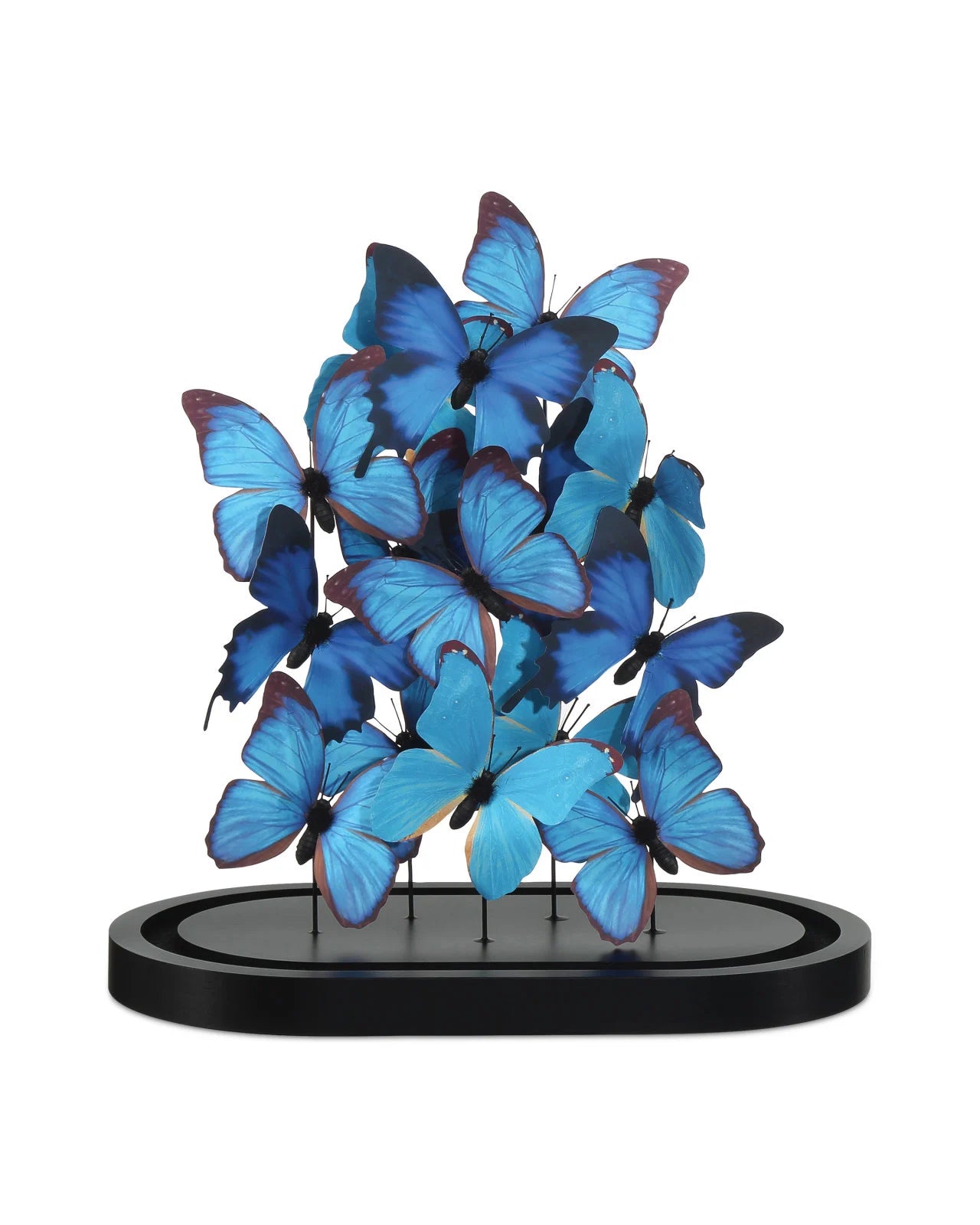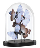 The Rue de Bac Butterflies are lovely encased specimens made of blue paper with black accents that are displayed within a clear glass dome. Sitting atop a wood base in a black finish. Named for the Parisian street on which a famous French taxidermy is located, the artful butterflies that flutter in this sculpture would feel right at home in that cabinet of curiosities that holds some of the most remarkable wonders of entomology.
