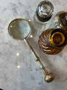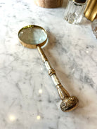 This elegant vintage magnifying glass showcases a refined blend of gold and silver pearl finishes. Measuring 11 inches long and 4 inches wide, its ornate design adds a touch of sophistication to any desk or study. Perfect for reading fine print or examining details with style, it combines timeless craftsmanship with practical function.